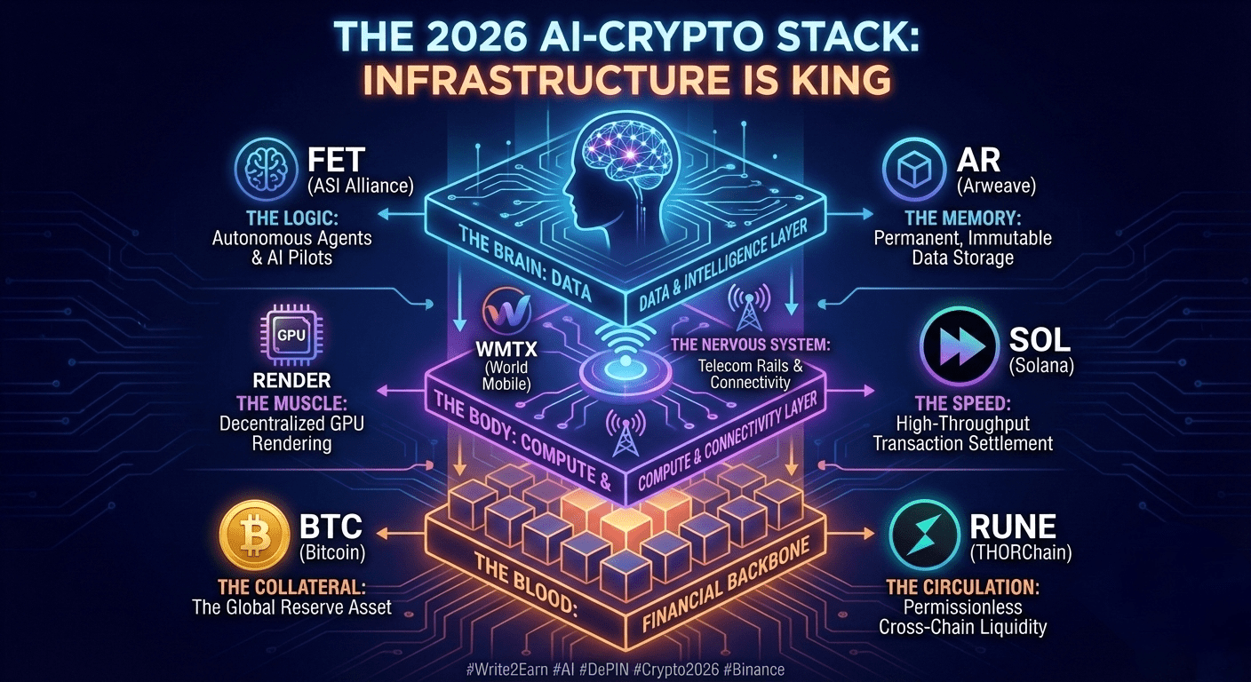 Wenn Sie isolierte KI-Token verfolgen, ohne die DePIN (Dezentralisierte Physische Infrastruktur Netzwerke), die sie unterstützen, zu berücksichtigen, bauen Sie auf Sand. Meine zentrale These für 2026 dreht sich um den Besitz des gesamten "KI-Stacks." Hier ist, wie mein Portfolio $BTC, $FET, $AR, $RENDER, $SOL, $RUNE und $WMTX für das Jahr positioniert ist.