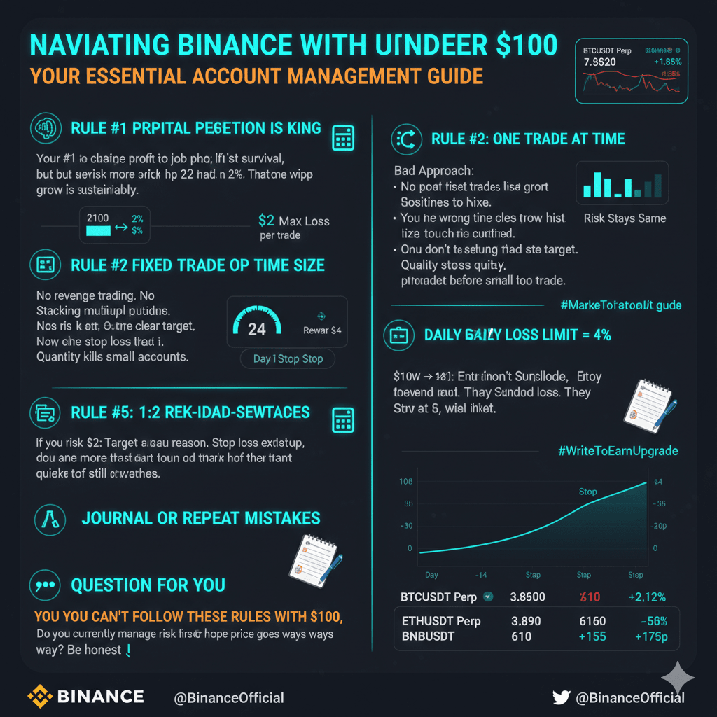 Ein Konto auf Binance mit $100 oder weniger zu verwalten, erfordert Disziplin und eine kluge Strategie. Vergiss große, schnelle Gewinne; konzentriere dich auf das Überleben und stetiges Wachstum.