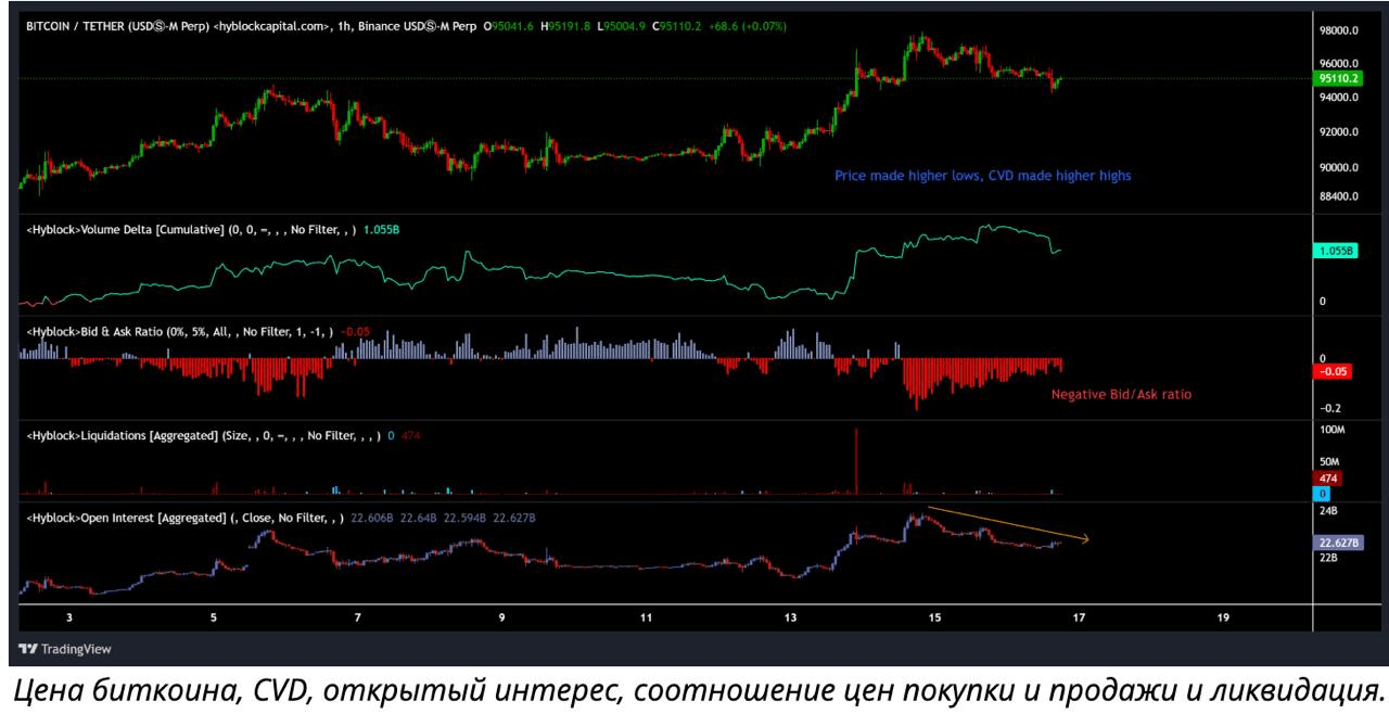📊 Der Versuch, $100.000 zu erreichen, stieß auf eine Wand: Nach einem lokalen Hoch bei $98.000 fiel der Preis zwei Tage hintereinander und sank bis Freitag unter $95.000. Der Coinbase-Premium war kurzzeitig im Plus.