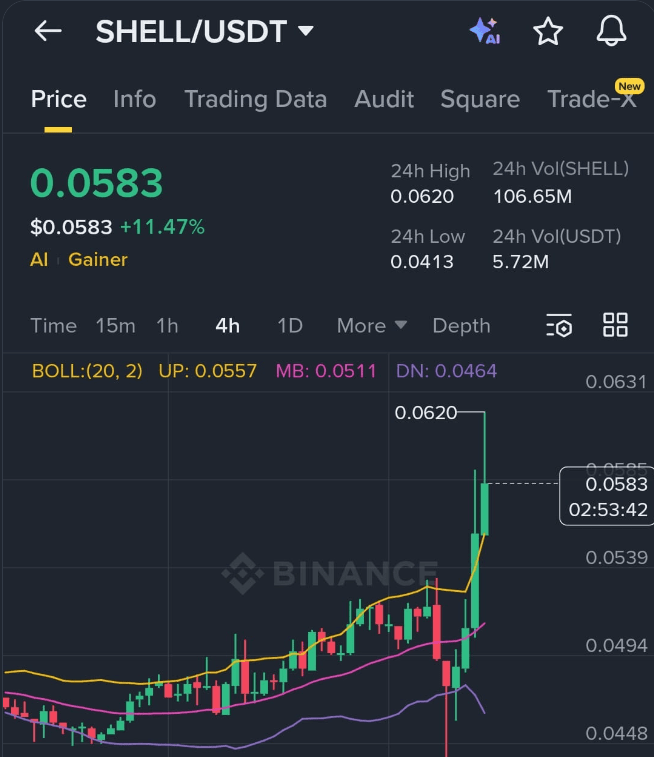 $SHELL zeigt aggressive bullish Stärke, handelt derzeit um 0,0583 mit einer scharfen Bewegung. Der Preis hat sich gut über die Mittellinie der Bollinger-Bänder ausgedehnt, was starke Dynamik und aktives Käuferinteresse bestätigt. Eine solche Expansion zieht in der Regel kurzfristige Händler an, aber das Risikomanagement ist nach einem so schnellen Move sehr wichtig.