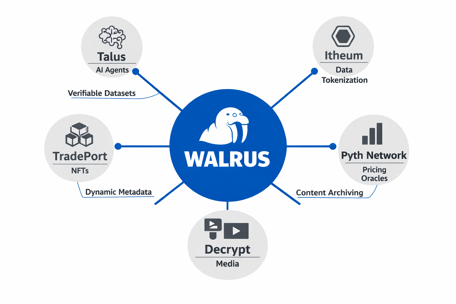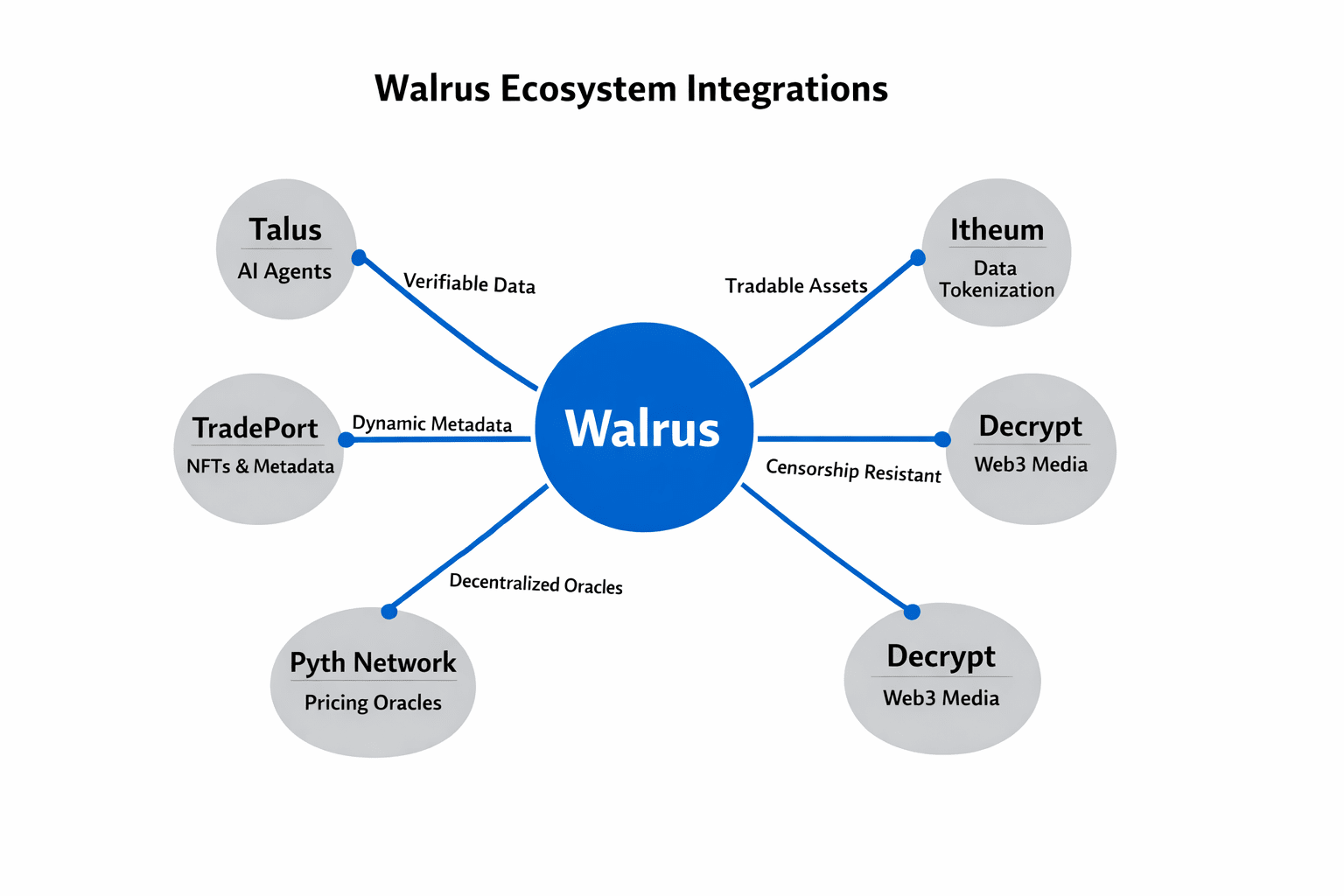Warum funktioniert das Walrus-Ökosystem so gut? Es ist kettenagnostisch und basiert auf Sui. Das Team wurde am 27. März 2025 im Mainnet gestartet und kam mit 140 Millionen Dollar von großen Namen wie Standard Crypto, a16z crypto und Franklin Templeton stark hinein. Diese Finanzierung treibt ihren Plan voran, sich mit über 100 verschiedenen Blockchains zu verbinden, wodurch Walrus zu einer echten Interoperabilitätskraft wird. Im Kern bewegt Walrus massive Daten – 4K-Videos, KI-Datensätze, 3D-Spieldateien – unter Verwendung von Red Stuff Erasure Coding. Es zerteilt Daten in Stücke, sichert sie 4,5-mal und hält alles am Laufen, selbst wenn Teile fehlen, alles mit nur 5-fachem Overhead. Es ist effizient, und das ist der Grund, warum so viele verschiedene Projekte es nutzen. TradePorts NFT-Marktplatz verlässt sich auf Walrus für aktualisierbare Metadaten, sodass NFTs sich ohne einen zentralen Server entwickeln können. Decrypt, ein führendes Web3-Medium, archiviert Artikel und Videos über Walrus für unzerbrechlichen Zugang. Sogar Pudgy Penguins migrierten ihre Inhalte über Tusky zu Walrus und sperrten sie dauerhaft ein.