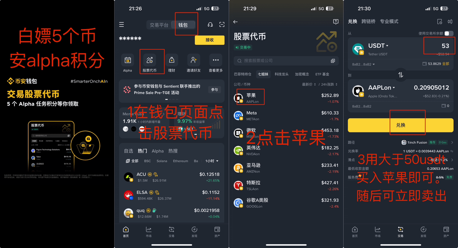 Sobald Sie Aktien-Token im Wert von mehr als 50 Dollar in der Binance-Wallet kaufen, können Sie 5 Alpha-Punkte erhalten. Die Aktionszeit ist vom 20.1. bis 3.2. Je früher Sie teilnehmen, desto besser. Falls das Projekt, das Sie mögen, nur 5 Punkte von Ihnen entfernt ist. Die Schritte zur Teilnahme finden Sie in Abbildung eins.