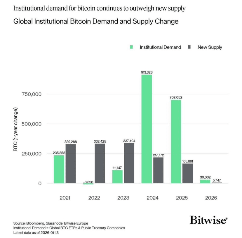 📊 Institutionelle Investoren haben etwa 6 Mal das Angebot von neu geschürftem Bitcoin im Jahr 2026 gekauft.