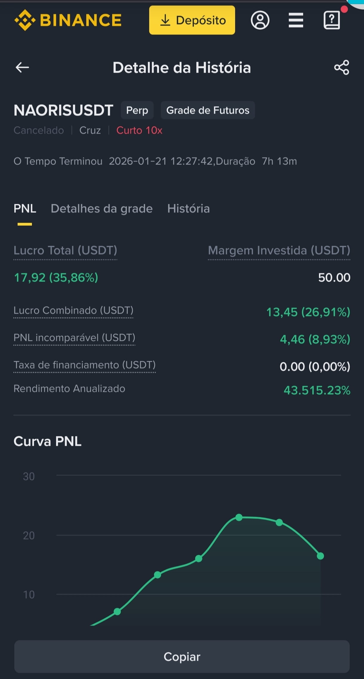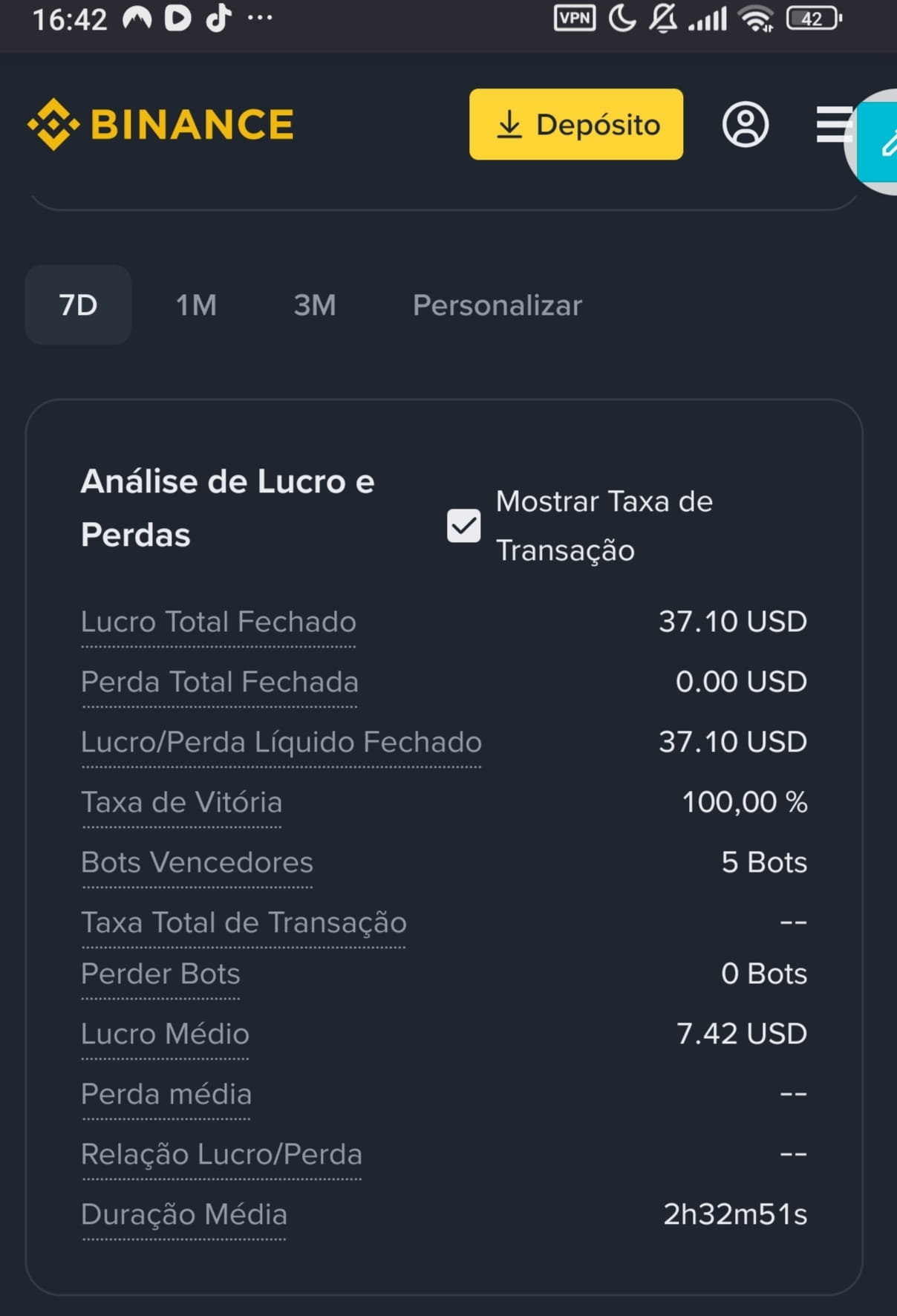 Dieses Bild ist von meinen Tests, um die Prozentsätze zu analysieren, ich bin mit niedrigen Werten eingestiegen, es ist (sehr wichtig, deinen BOT SEHR GUT zu konfigurieren), denn wenn du eine falsche oder außerhalb der Marktparameter und deiner Absicht liegende Konfiguration machst, wirst du mit Sicherheit Verluste haben!!!