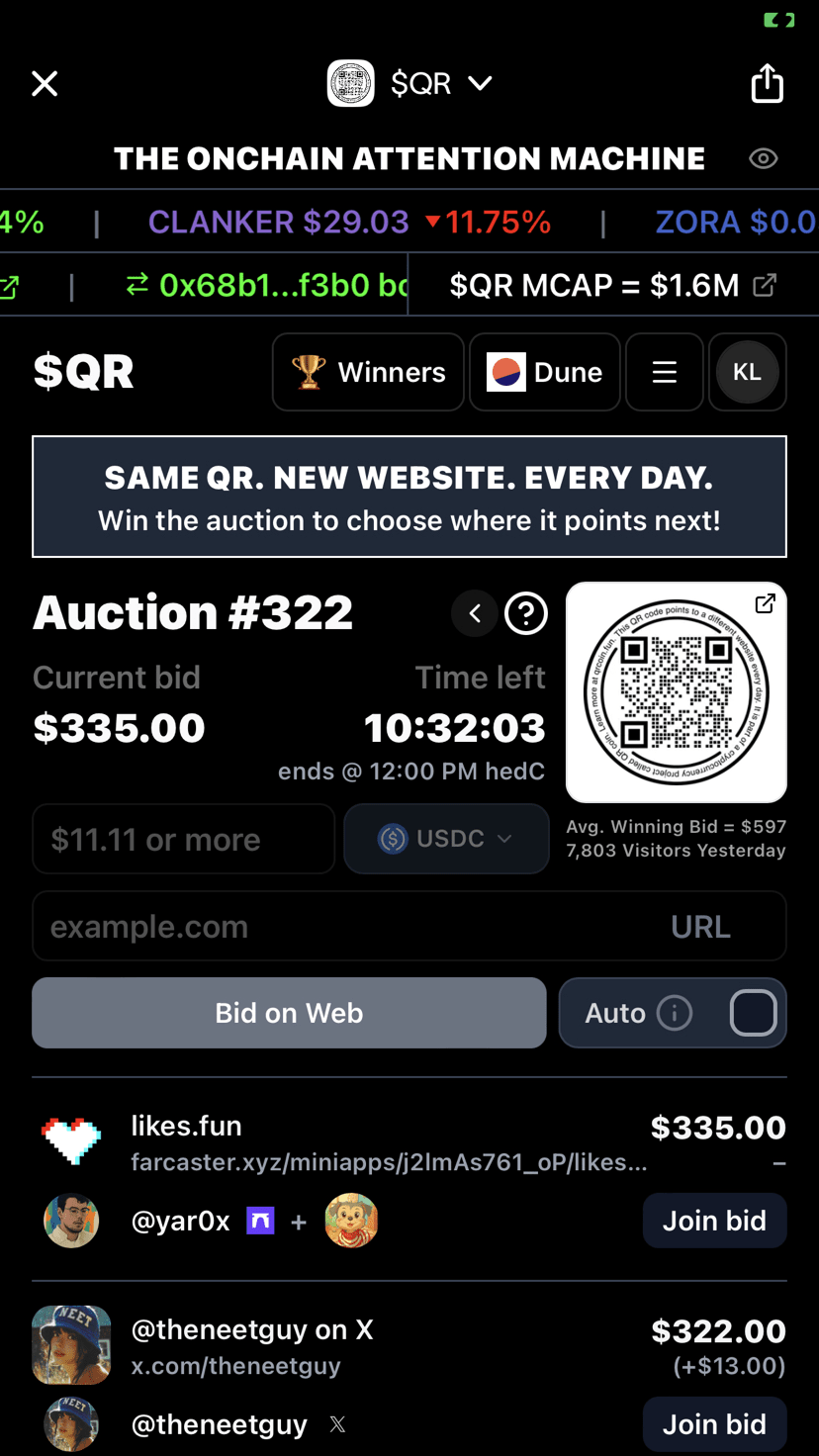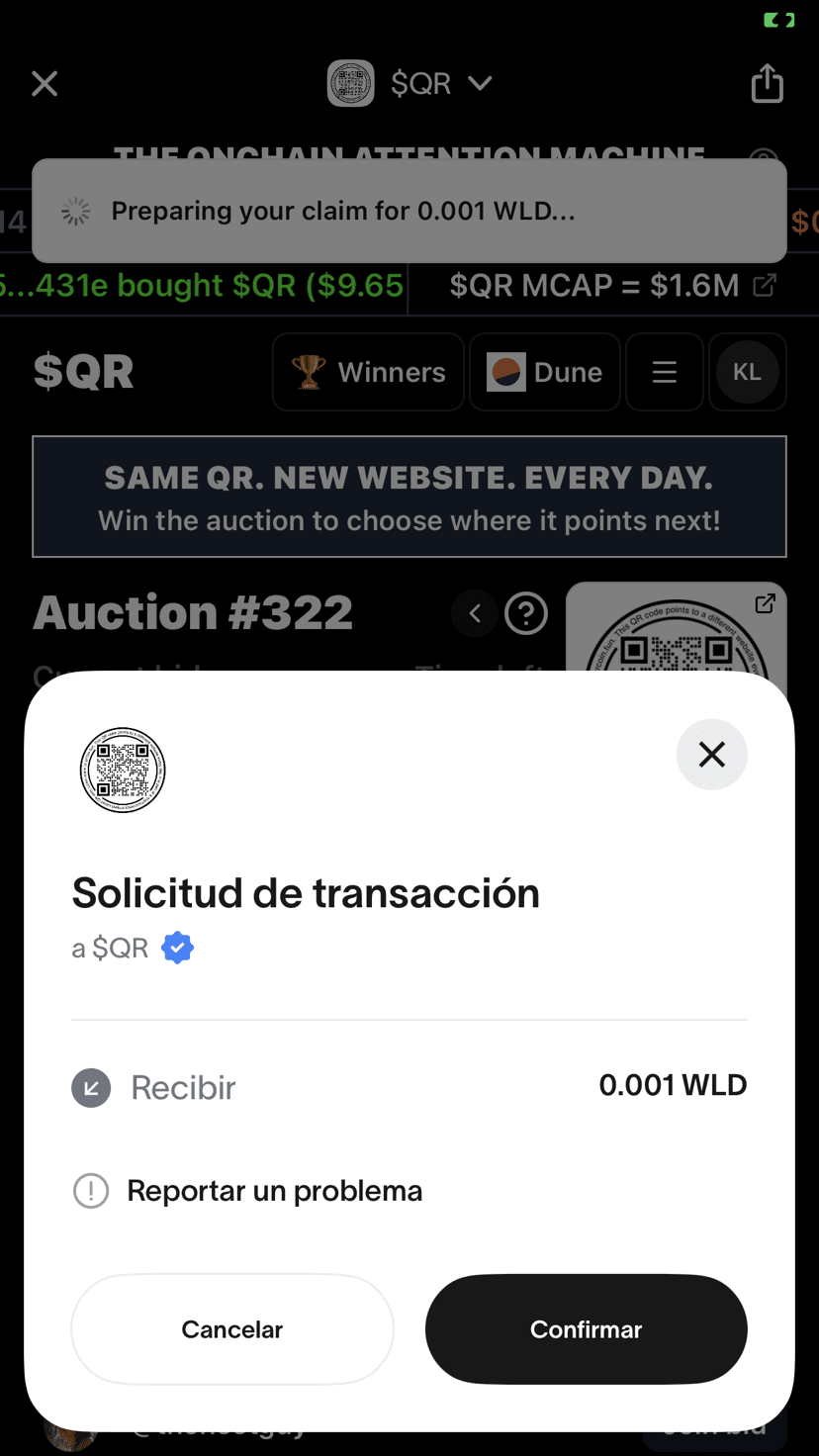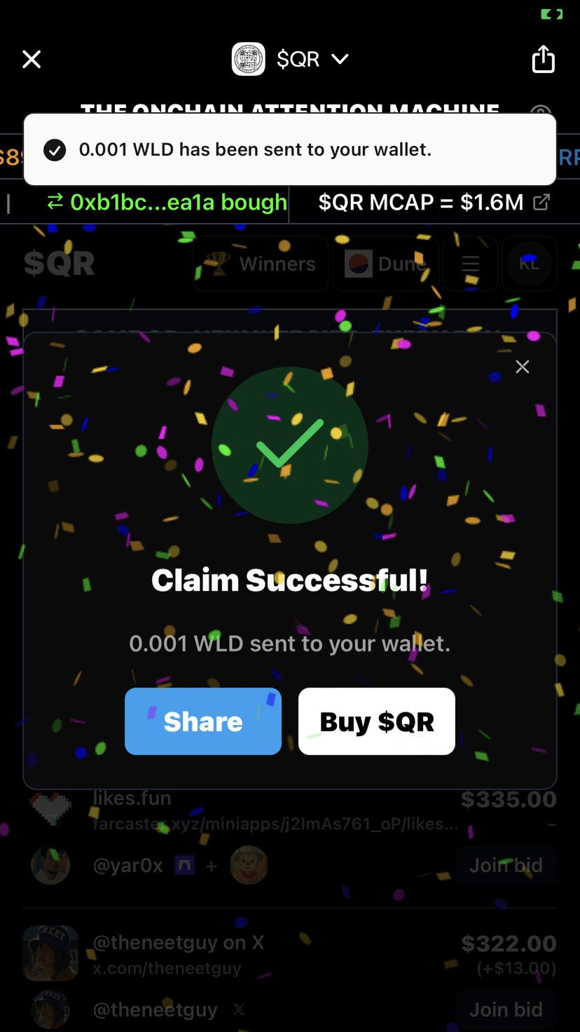 Mit $QR ändert sich die Website, auf die der Code verweist, jeden Tag durch eine Auktion. Das Beste: Du erhältst Anreize in $WLD nur dafür, dass du den Gewinner des Tages überprüfst.