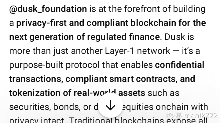 Die Finanzwelt entwickelt sich schnell weiter, und @Dusk ist an vorderster Front beim Aufbau einer datenschutzorientierten und konformen Blockchain für die nächste Generation regulierter Finanzen. Dusk ist mehr als nur ein weiteres Layer-1-Netzwerk — es ist ein speziell entwickeltes Protokoll, das vertrauliche Transaktionen, konforme Smart Contracts und die Tokenisierung von realen Vermögenswerten wie Wertpapieren, Anleihen oder digitalen Aktien onchain mit intaktem Datenschutz ermöglicht. Traditionelle Blockchains machen alle Aktivitäten öffentlich, was die institutionelle Akzeptanz einschränkt und Datenschutzbedenken aufwirft. Die Architektur von Dusk verwendet Zero-Knowledge-Beweise und fortschrittliche Kryptografie, um sicherzustellen, dass sensible Daten — wie Transaktionsbeträge und Geschäftslogik — privat bleiben, während sie bei Bedarf dennoch überprüfbar und auditierbar sind. �