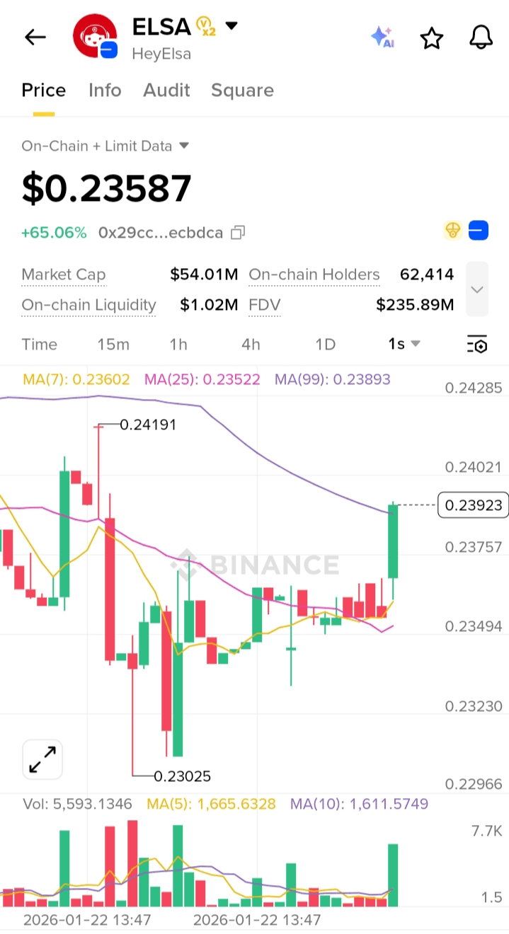 1. Preis und Volatilität: * Am 22. Januar 2026 liegt der aktuelle Preis von ELSA bei etwa 0,23587 $.