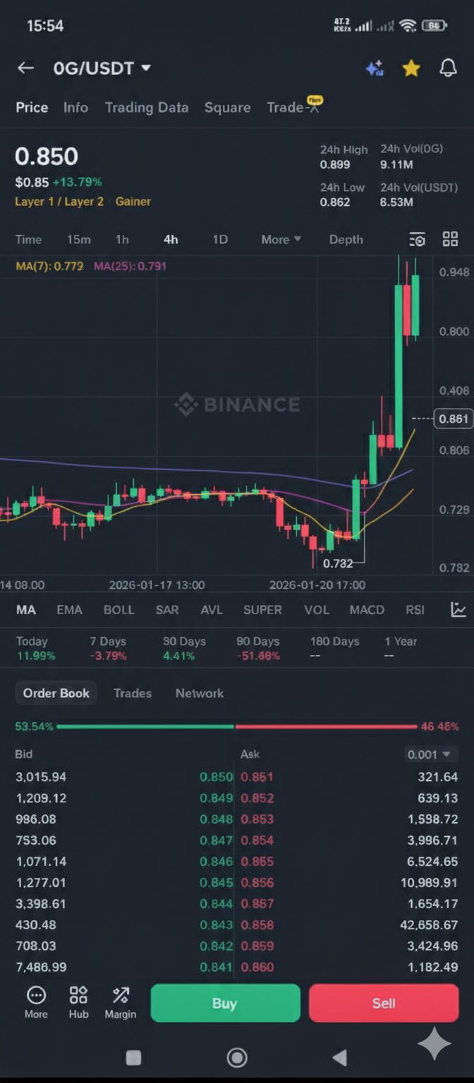 Das 4-Stunden-Diagramm für 0G/USDT malt ein überzeugendes Bild. Nach einer Phase der Konsolidierung und einem Rückgang haben wir einen explosiven Anstieg erlebt, wobei der Preis signifikant ausgebrochen ist. Das ist nicht nur ein kleiner Anstieg; es ist eine kraftvolle Aufwärtsbewegung, die die Aufmerksamkeit erfahrener Händler und Neulinge gleichermaßen auf sich gezogen hat.