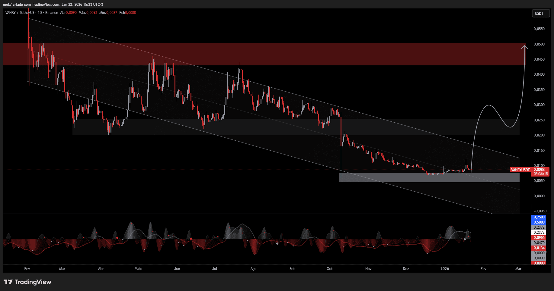 Im technischen Bereich des Tradings, bei der Analyse des täglichen Charts von VANRY/USDT, sehen wir einen abwärtsgerichteten Trend seit dem Höhepunkt von $0.05 Mitte 2025, mit dem aktuellen Preis von $0.0089 nach einer Ablehnung bei höheren Widerständen. Der Schlüsselunterstützungsbereich bei $0.0075 wurde kürzlich getestet, wobei die abwärtsgerichtete Trendlinie drückt, aber der WaveTrend-Indikator zeigt eine deutliche bullische Divergenz: Der Oszillator bildet höhere Tiefs, während der Preis sinkt, was auf angesammelten Käufermomentum und eine potenzielle Umkehr hindeutet. Das On-Chain-Volumen ist in der Woche um 15% gefallen, aber OBV bestätigt subtile Zuflüsse. Der RSI bei 42 vermeidet extremes Überverkauftsein, und der MACD zeigt Anzeichen eines bullischen Kreuzes im wöchentlichen Chart. Projektion: Wenn der abwärtsgerichtete Trend durchbrochen wird, ist eine Liquiditätsaufnahme über $0.045-0.05 möglich, mit dem Ziel von $0.10 in der Altseason-Rotation – Setup für vorsichtige Long-Positionen in unterbewerteten Alts.