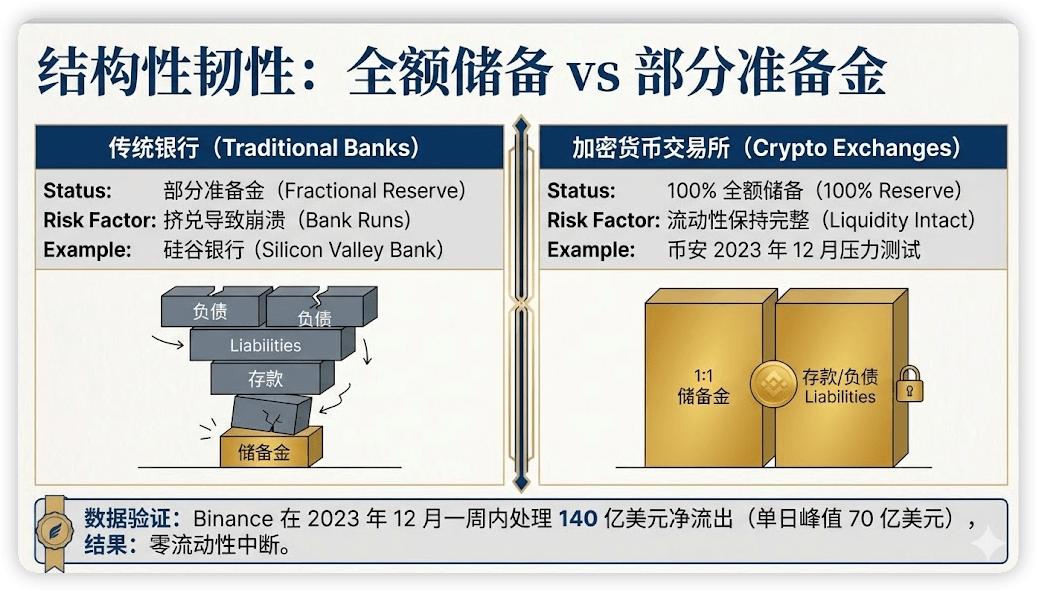 Um die Überlegenheit der nativen Finanzierungen durch Kryptowährungen zu beweisen, nannte CZ einen Extrem-Stresstest von Binance im Jahr 2023: Innerhalb einer Woche verarbeitete Binance Nettoabflüsse von bis zu 14 Milliarden US-Dollar, wobei der tägliche Auszahlungshöhe 7 Milliarden US-Dollar erreichte, während der Betrieb der Plattform unbeschädigt blieb. Dieses Modell mit 100% Vollreserve beweist, dass, solange die Sicherheit der Vermögenswerte angemessen gewährleistet ist, die Geschwindigkeit der Abhebungen die Zahlungsfähigkeit nicht beeinträchtigen kann. Diese Äußerungen sind vor dem Hintergrund des Zusammenbruchs traditioneller Institutionen wie der Silicon Valley Bank aufgrund von Veränderungen im makroökonomischen Umfeld besonders eindringlich. Dieses auf Mathematik und Echtzeit-Blockchain-Validierung basierende Modell „100% Vollreserve“ ermöglicht es den Krypto-Institutionen, der Liquiditätskrise, wie sie bei der Silicon Valley Bank auftrat, gelassen entgegenzutreten und eine Dimensionen-Reduzierung auf das alte System zu erreichen. Im Hinblick auf die Sicherheit der Vermögenswerte haben führende Krypto-Börsen möglicherweise bereits mehr Resilienz als traditionelle Banken.