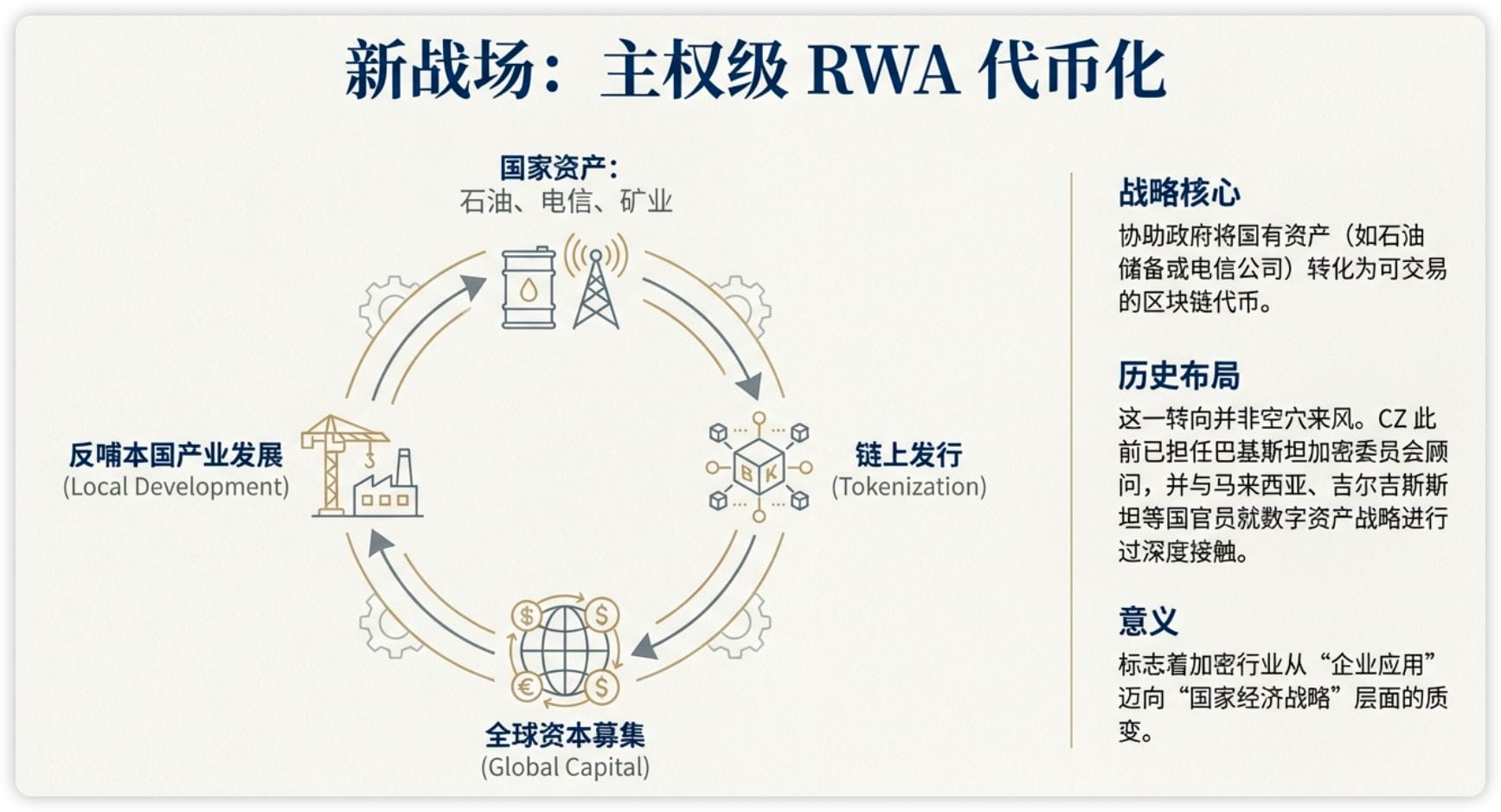 Derzeit gibt CZ bekannt, dass er mit etwa 12 Regierungen im Gespräch ist, um die nationale Tokenisierung von Vermögenswerten voranzutreiben. Diese Zusammenarbeit hat die Grenzen der Einhaltung von Vorschriften überschritten und ist in die Phase der Rekonstruktion von Produktivität eingetreten. Beispielsweise können Regierungen durch die Verbriefung von Energie-Reserven oder öffentlichen Infrastrukturen teure traditionelle Schuldeninstrumente umgehen und Vermögensverwertungen und industrielle Entwicklungen ohne Abhängigkeit von traditionellen Schuldeninstrumenten unterstützen. Die Krypto-Industrie hat den Dienst an individueller Spekulation offiziell auf den Dienst an der nationalen Souveränität und Kreditwürdigkeit umgestellt.