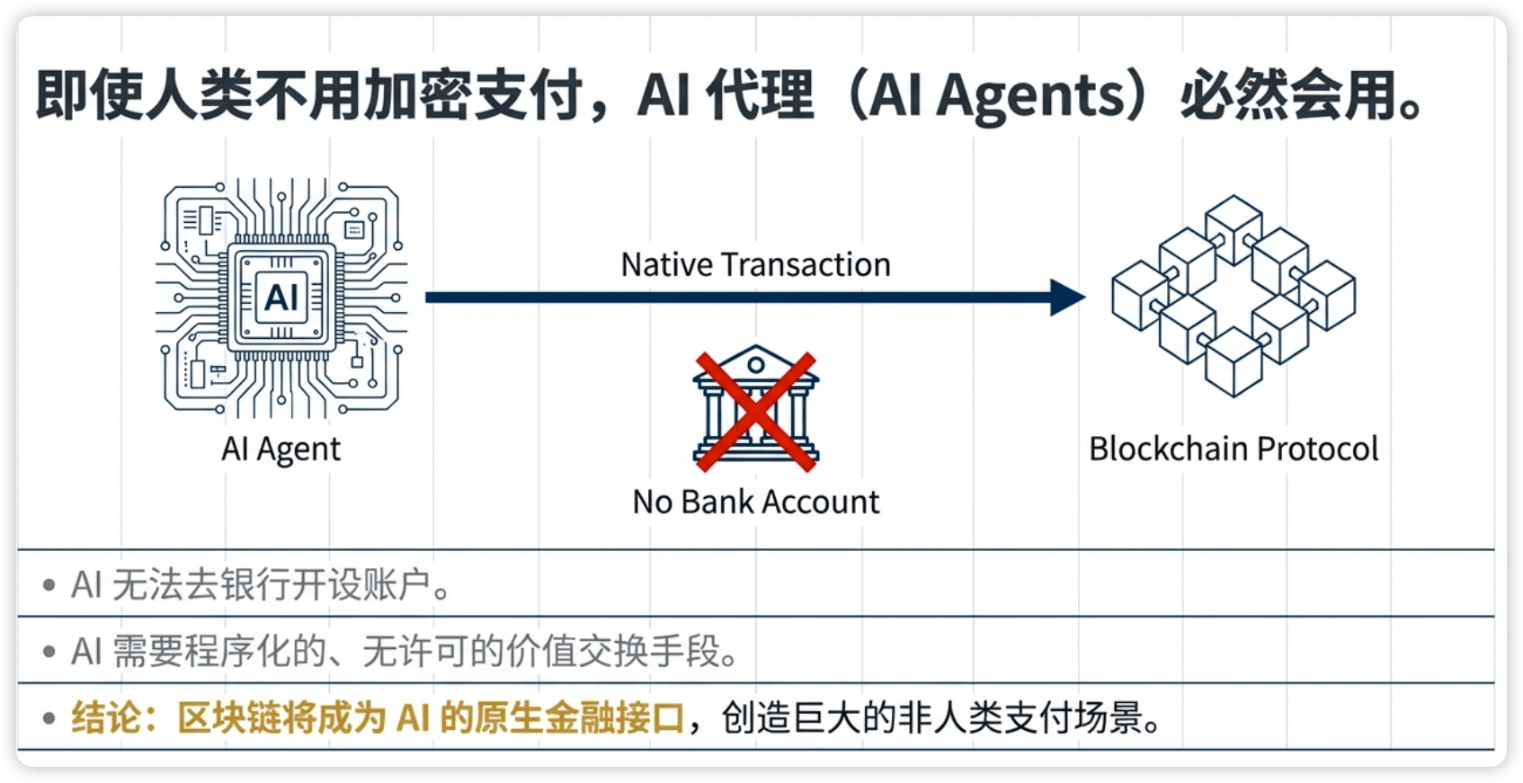 Künftige KI-Agenten werden den Großteil menschlicher Entscheidungen übernehmen, sie müssen hochfrequente, programmatische und ohne Vermittlungsgenehmigung durchführbare Werttransaktionen durchführen. Da KI im rechtlichen Sinne keine physische Identität hat, kann sie keine Konten bei traditionellen Banken eröffnen. Daher werden Kryptowährungen unvermeidlich die nativen Währungen der KI-Welt werden, was nicht nur enorme nicht-menschliche Zahlungsszenarien schafft, sondern den Krypto-Vermögenswerten auch echte produktive Eigenschaften jenseits der Spekulation verleiht.