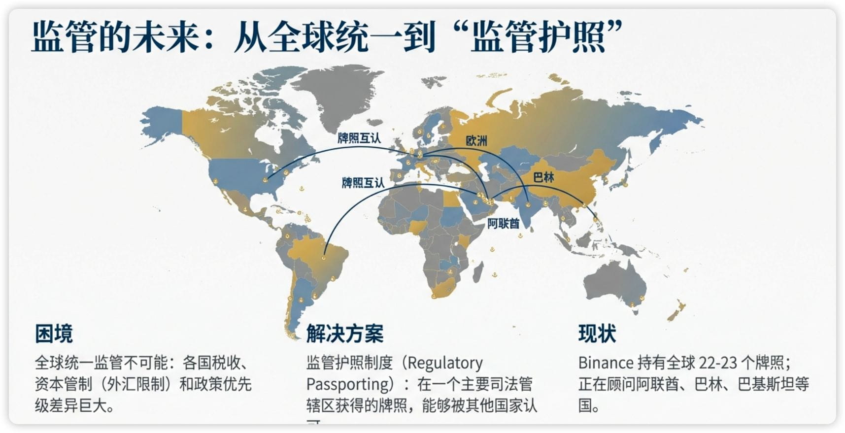 Die aktuelle regulatorische Umgebung ist in der Tat ziemlich fragmentiert. Obwohl Binance weltweit etwa 23 internationale Lizenzen hält, stellte CZ klar, dass die Unterschiede in den regulatorischen Strukturen weltweit enorm sind und stark fragmentiert. Die Unterschiede in den Kapitalbeschränkungen und Steuerpolitiken der einzelnen Länder machen es nahezu unmöglich, kurzfristig eine einheitliche globale Regulierungsbehörde zu schaffen.