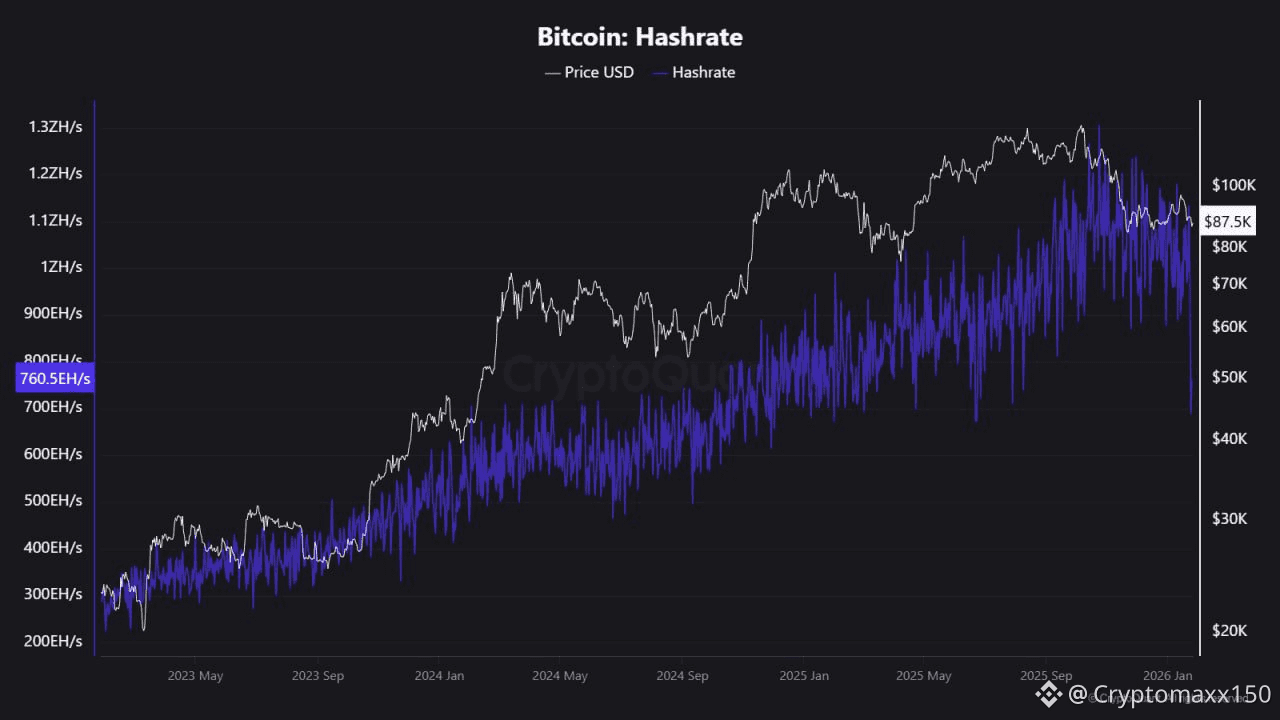 In diesem harten Klima ist das Bitcoin-Netzwerk nicht immun. Die #Bitcoin-Mining-Ausrüstung, die vollständig auf ununterbrochene elektrische Energie angewiesen ist, erlebte einen scharfen und dramatischen Rückgang der Mining-Aktivitäten (Hashrate), während wichtige Mining-Anlagen die Betriebe verlangsamten oder ganz einstellten. Dieser Wandel war nicht nur eine technische Schwankung; er war eine praktische Reaktion auf Energieengpässe, da Miner ihre Maschinen herunterfuhren, um Strom für Krankenhäuser, Haushalte und Notfalldienste umzuleiten. Das Ergebnis hebt eine unerwartete Interaktion zwischen digitaler Infrastruktur und den physischen Einschränkungen der realen Welt hervor.