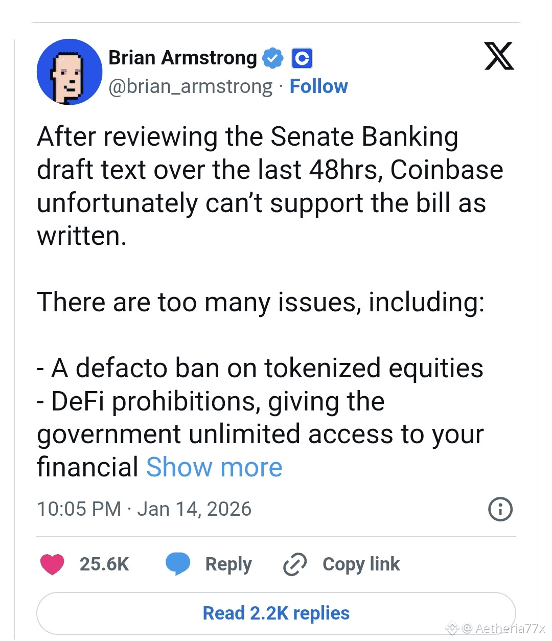 Brian Armstrong (Coinbase) a partagé une confidence marquante : le CEO d'une des 10 plus grandes banques mondiales lui a avoué que la crypto est désormais leur "priorité n°1". Les banques voient dans les stablecoins et la tokenisation une menace directe pour leur modèle de profit. Ils doivent s'adapter ou risquer la désintermédiation totale.