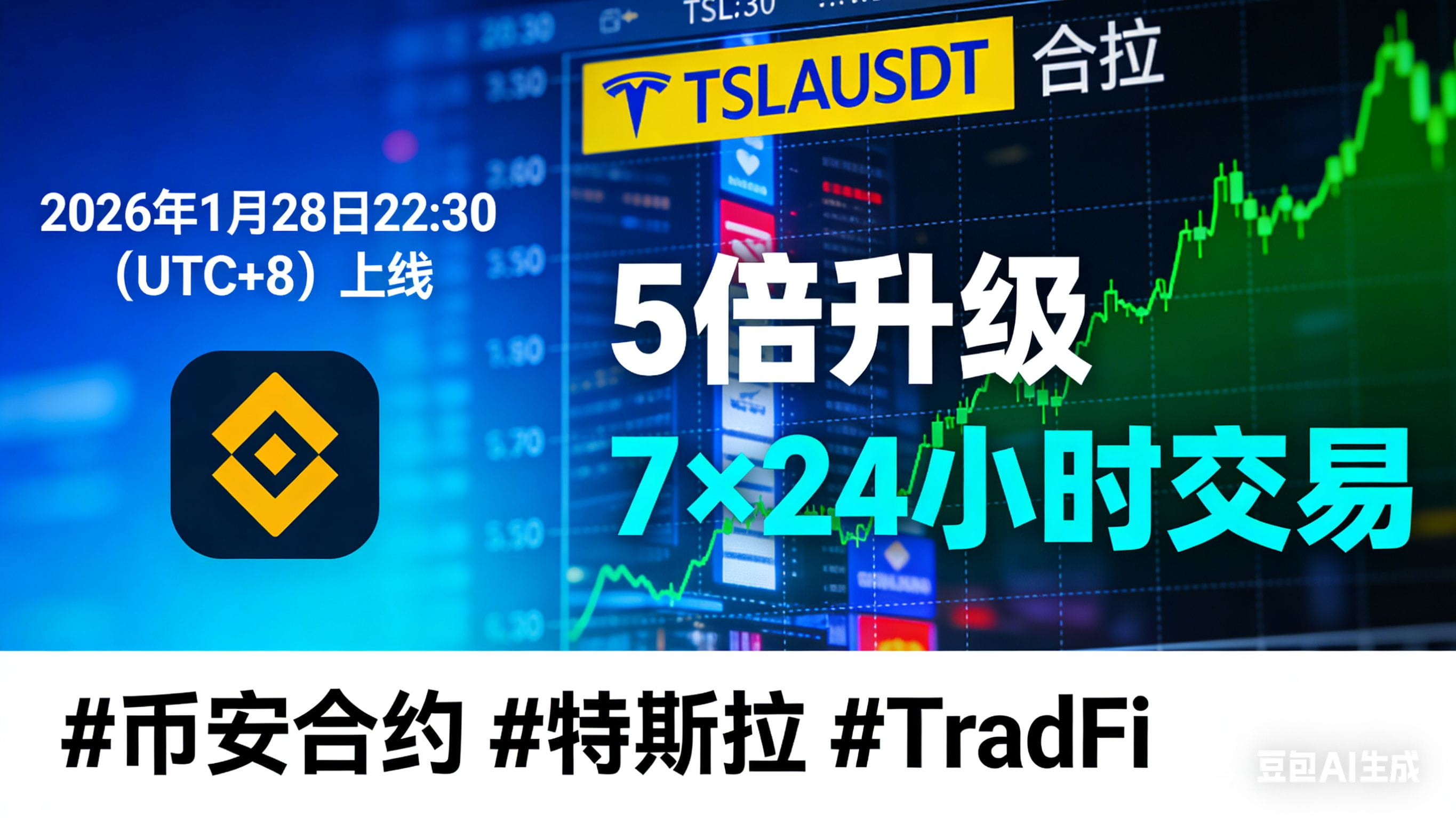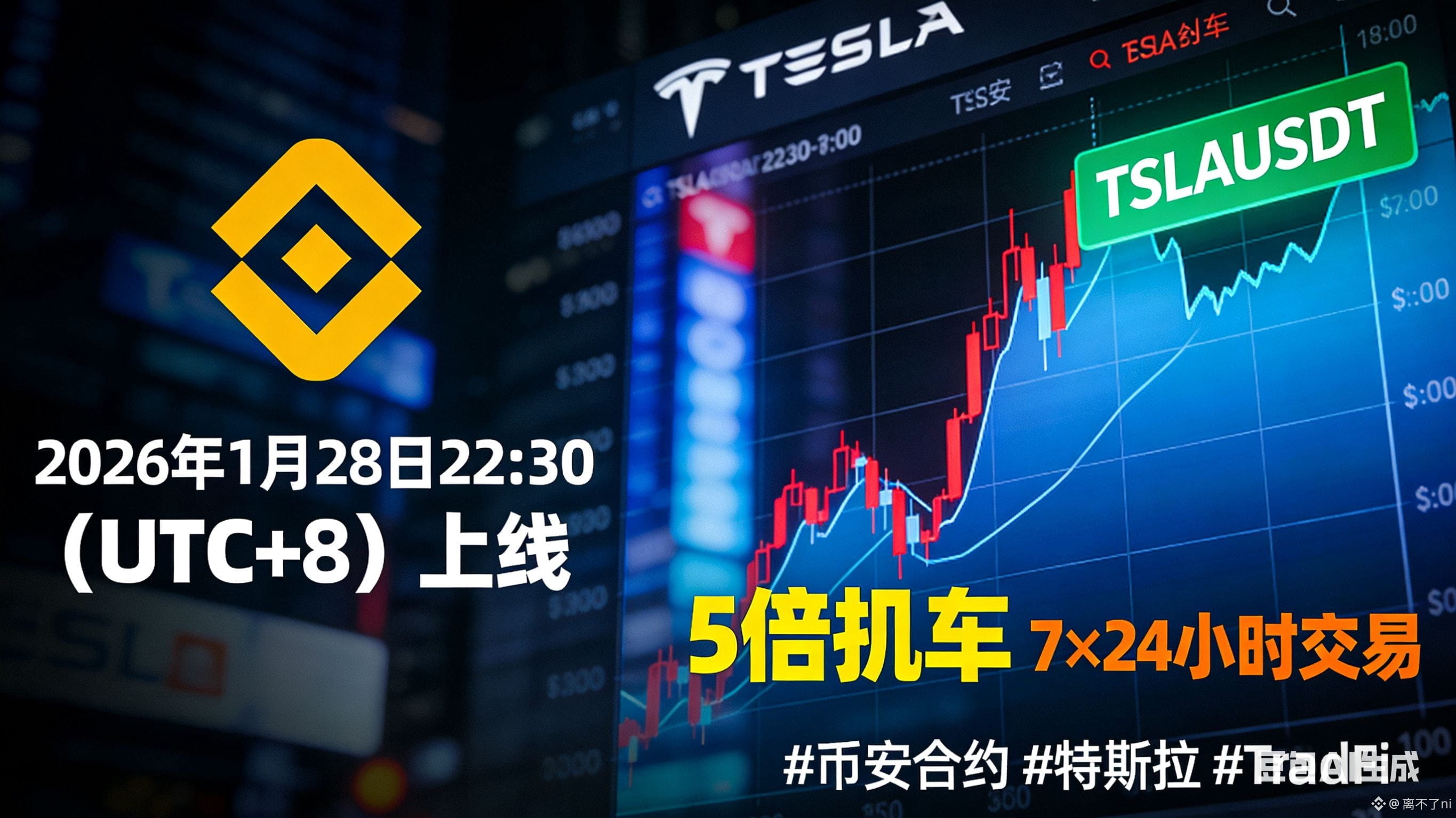 币安期货近日正式宣布,将于2026年1月28日22:30(UTC+8)推出USDⓈ本位TSLAUSDT特斯拉股票永续合约,标的对应纳斯达克上市的特斯拉普通股。这一动作标志着币安在传统金融资产(TradFi)与加密市场融合的道路上再次加码,为全球交易者提供更灵活的特斯拉敞口。