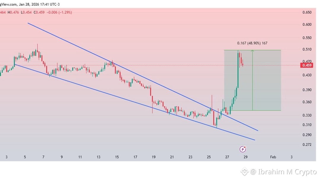 * Gleitende Durchschnitte: Der Preis liegt knapp über dem EMA(7) ($0,428) und bleibt weit über dem EMA(25) ($0,383) und EMA(99) ($0,378). Dieses "Goldene Kreuz"-Setup im 4H-Zeitrahmen deutet darauf hin, dass sich der kurzfristige Trend in eine bullische Richtung gewendet hat.