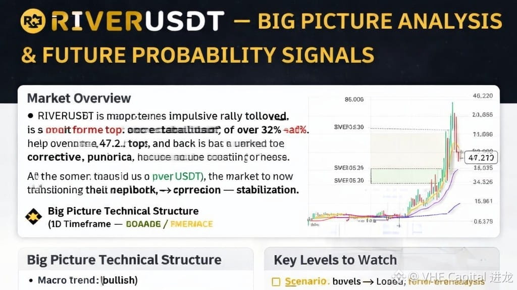 Hier ist eine saubere, erklärende $RIVER RIVERUSDT Gesamtbild + zukünftige Wahrscheinlichkeitssignale, basierend auf dem Diagramm, das du geteilt hast.