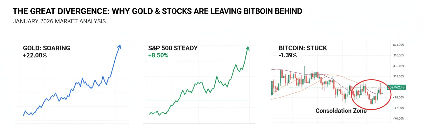 Die Erholungszone: Bitcoin muss über $92,000 brechen und schließen, um zu beweisen, dass die "Bullen" wieder die Kontrolle haben. Bis dahin spielt es die zweite Geige zu Gold.