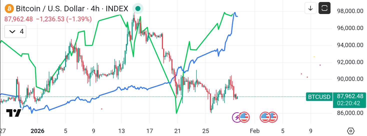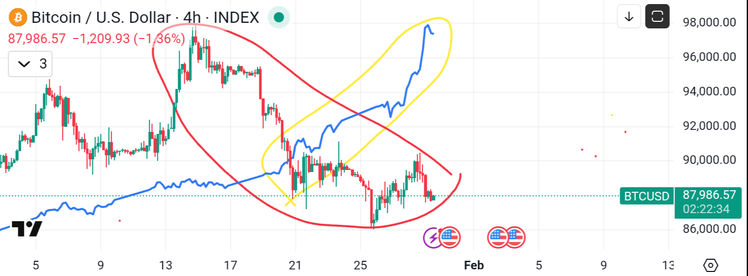 Die Hauptkerzen (Bitcoin): Das ist das "Digitale Gold", das still geworden ist. Während Gold neue Höchststände erreicht, kämpft Bitcoin darum, über $88,000 zu bleiben. Es ist derzeit in einem Abwärtstrend gefangen (der rote Kreis im Chart).