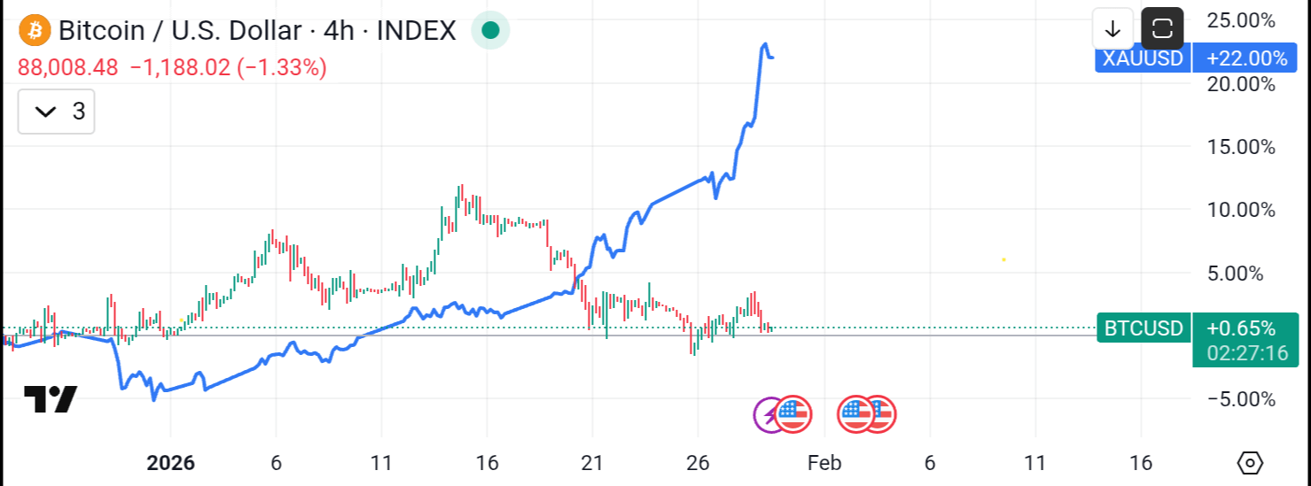 Die Strategie: Behalte die blaue Linie (Gold) im Auge. Historisch gesehen fließt das "Sicherheitsgeld" normalerweise direkt wieder in Bitcoin für den nächsten großen Pump, sobald Gold seinen massiven Anstieg beendet und seitwärts geht.