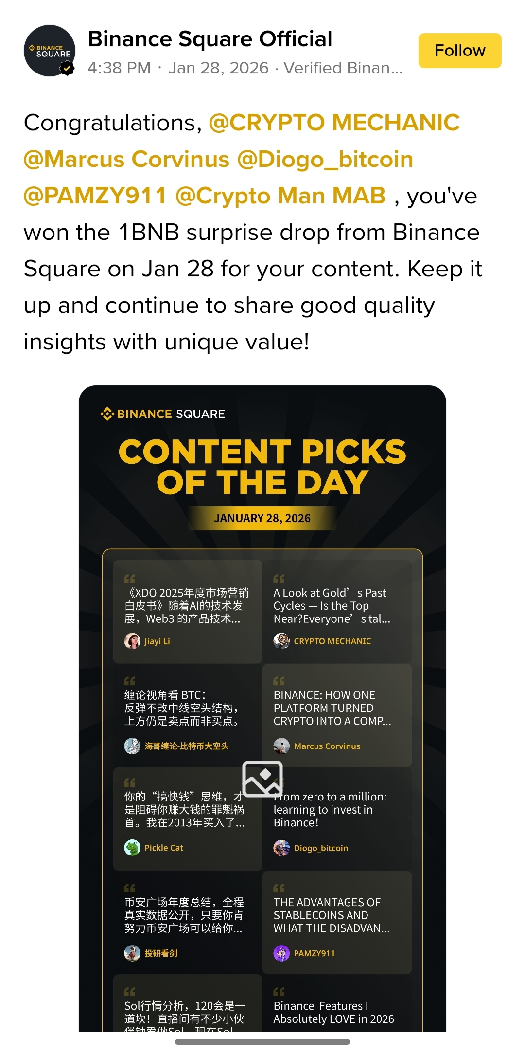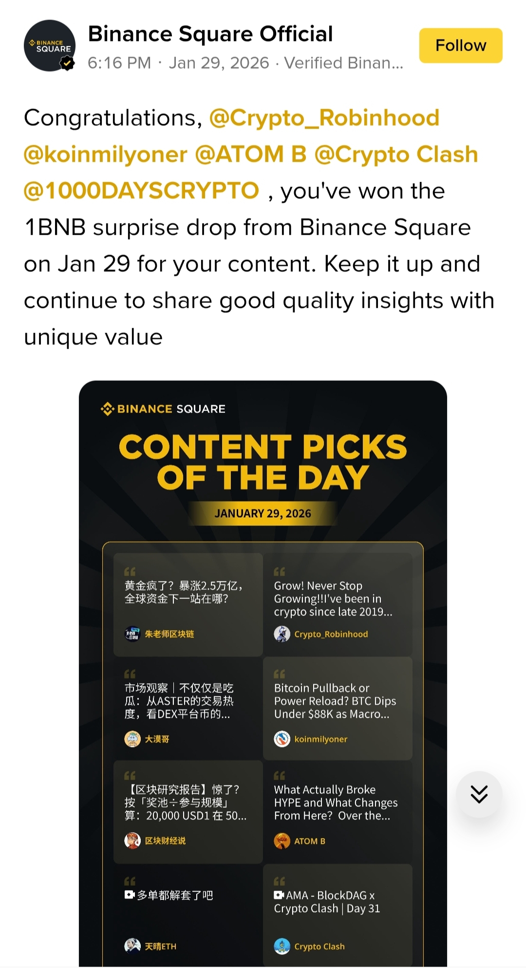 Tägliche Überraschungs-Drops → Binance wählt die besten Posts und gibt 1 BNB (oder Anteile größerer Pools)
