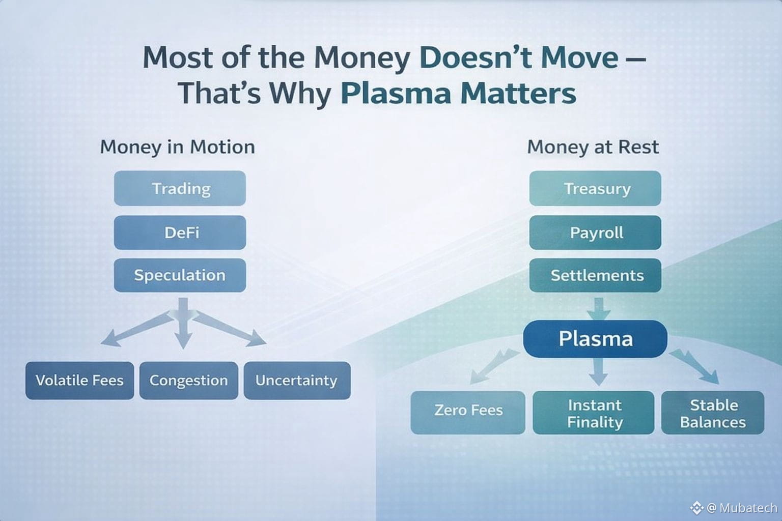 Most blockchain research is obsessed with movement. Faster transactions, higher throughput, more activity per second. That makes sense on the surface—but it also misses something important. When you start thinking about Plasma, the more interesting question isn’t how fast money moves, but why most money doesn’t move at all.
