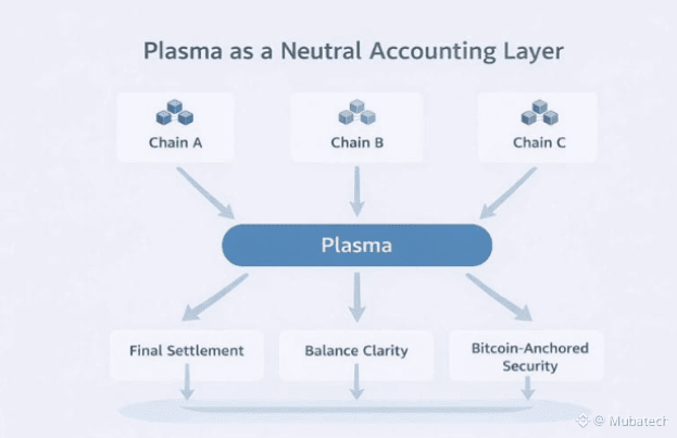 Another angle people don’t talk about enough is Plasma acting as a neutral accounting layer between blockchains. Instead of every chain fighting to host everything, Plasma becomes a stable backbone. Other chains can plug into it. Assets might live elsewhere, but balances and settlements stay clear and readable on Plasma. That’s closer to how clearinghouses work in traditional finance, not how smart-contract platforms usually behave.