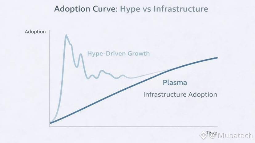 Because of that, Plasma follows a different adoption path. It doesn’t grow through hype or incentives. It grows quietly, through integrations. One treasury connects, then another. A single payroll setup leads to continuous usage. Growth may look slower, but it sticks. This isn’t community hype—it’s infrastructure adoption.