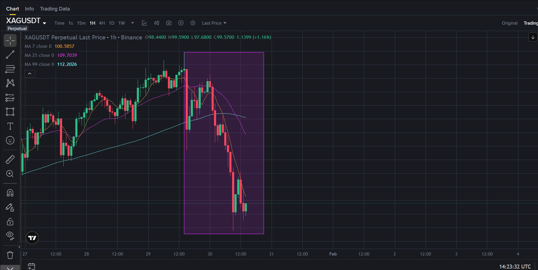 Silber ist in den letzten Wochen auf Rekordhöhen gestiegen, da Investoren strömten (über 100 %+ im Vergleich zum Vorjahr). Als die Preise extreme Höhen erreichten, begannen viele Händler zu verkaufen, um Gewinne zu realisieren, was zu einem plötzlichen Rückgang führte.