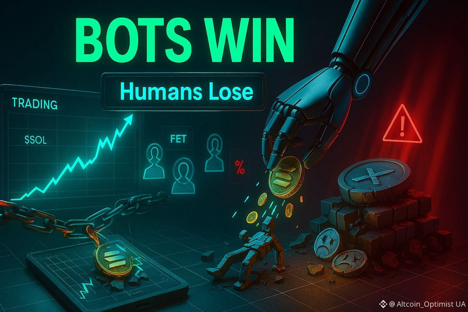 Data shows 65% of bots end positive yearly, with less ups and downs. Humans hit 5-15% average. Take $SOL and $FET . Bots using grid strategies turned 50-80% profits on 's volatility this month. I bet they beat solo traders by double. But watch, no bot wins forever alone.