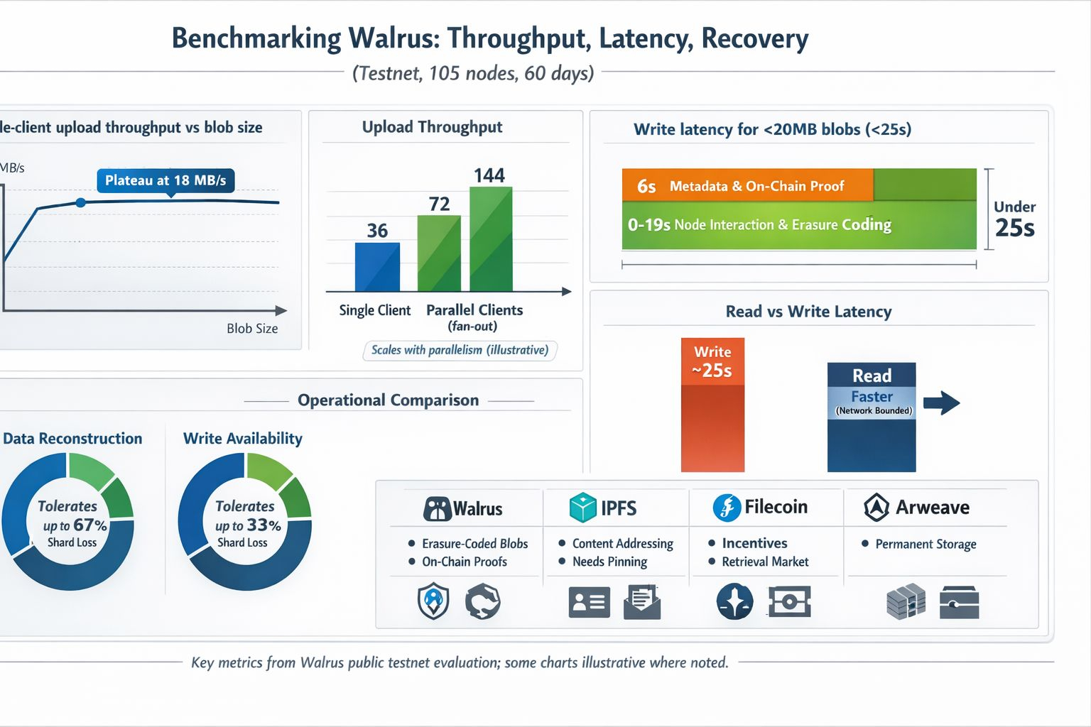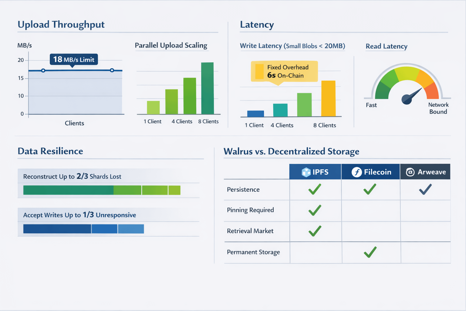 Die Latenz ist der Bereich, in dem Sie die Designentscheidungen am schärfsten spüren. Bei kleinen Blobs (unter 20 MB) berichtet die Bewertung, dass die Schreiblatenz unter 25 Sekunden bleibt, und erklärt, dass die Blob-Größe bei diesem Maßstab nicht der Haupttreiber ist; fixe Overheadkosten dominieren. Ungefähr sechs Sekunden entfallen auf die Verarbeitung von Metadaten und das Veröffentlichen des Nachweises on-chain. Lesevorgänge sind durchweg schneller als Schreibvorgänge und werden als durch die Netzwerkverzögerung begrenzt beschrieben, was eine zurückhaltende Art ist zu sagen, dass Geografie und Routing wichtiger sind als Protokolloverhead, sobald der Blob bereits platziert ist.