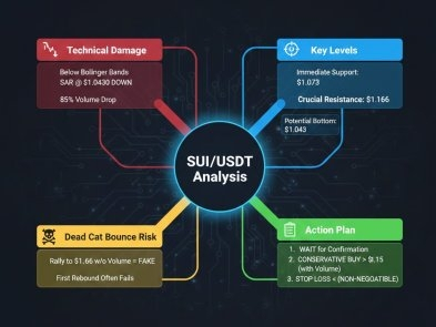 $SUI/USDT: Die $1.073-$1.166 Last Stand Analyse Zusammenfassung: Der Rückgang von SUI auf $1.1204 spiegelt erhebliche technische Schäden wider, wobei der Preis nun unter allen wichtigen Bollinger-Niveaus gehandelt wird und der SAR nach unten auf $1.0430 zeigt. Am besorgniserregendsten ist der Rückgang des Volumens um 85 % - ein Zeichen für verlorenes Interesse oder heimliche Akkumulation. Das Tief von $1.073 ist die unmittelbare Unterstützung; ein Durchbruch hier öffnet den Weg zu $1.043. Das Dead Cat Bounce Risiko: Jede Rallye in Richtung $1.166 ohne einen signifikanten Volumenzuwachs ist wahrscheinlich ein kurzlebiger Bounce - ein "Dead Cat Bounce", der bullische Trader fängt, bevor der Abwärtstrend wieder aufgenommen wird. In schwachen Märkten schlägt der erste Rückschlag oft fehl. Klarer Aktionsplan: · Warten auf Bestätigung: Durchbruch über $1.166 oder unter $1.073 · Konservative Einstieg: nur über $1.15 mit Volumenbestätigung · Nicht verhandelbarer Stopp: unter $1.07 für jeden Long-Versuch Entscheidungszeit: Kann SUI über $1.073 stabilisieren und eine Basis bilden, oder wird es in Richtung $1.04 brechen? Zeit zu entscheiden. #ByX IMPACT Leaederboard $SUIUSDT