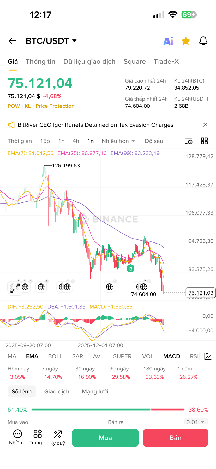 Zu Beginn der Woche (02/02/2026) erhielt BTC erneut einen starken Schlag, der den Preis in den Bereich von 75.xxx brachte – der niedrigste Stand seit dem letzten Dip.