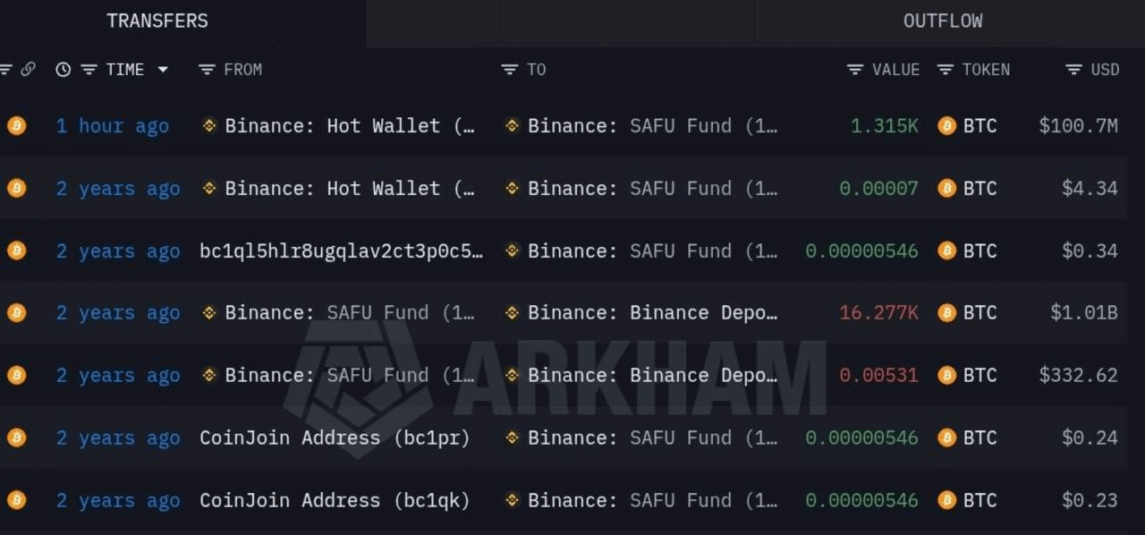 Binance hat $100.7M aus dem SAFU-Fonds in Bitcoin bewegt — während der Markt weiterhin blutet.