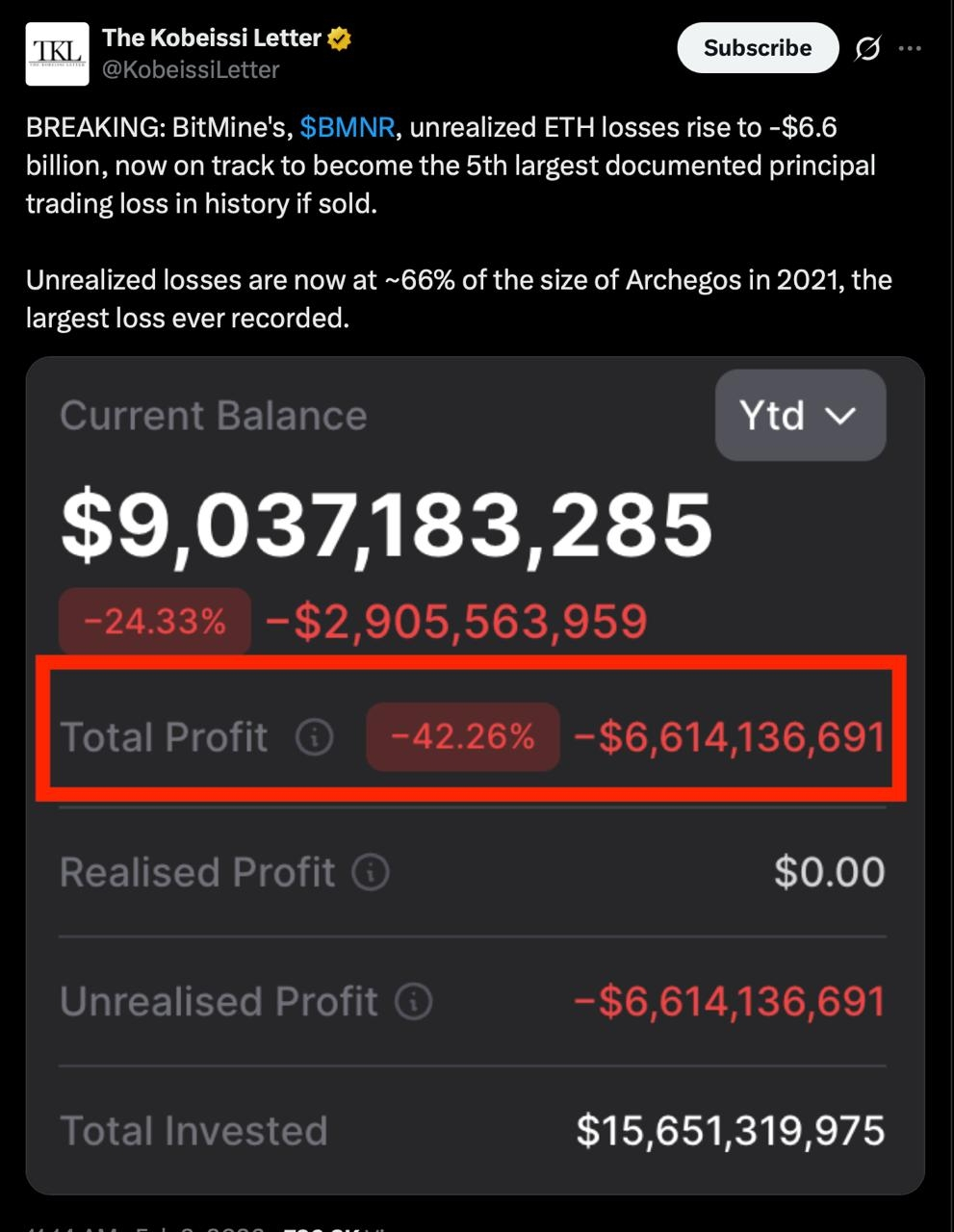 Laut Zahlen, die von Marktanalysten hervorgehoben wurden, sind die unrealisierte Verluste von BitMine aus seiner Ethereum-Exposition auf etwa 6,6 Milliarden Dollar gestiegen.