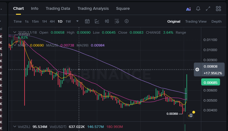 Ein weiteres Schlüsselelement ist die Volatilitätserweiterung nach längerer Kompression. ZIL hatte sich wochenlang in einer niedrig-volatilen Umgebung befunden. Märkte bewegen sich in Zyklen, und wenn die Volatilität zu lange komprimiert wird, wird die Expansion unvermeidlich. Die scharfe Aufwärtsbewegung spiegelt die Preisneuausbalancierung nach einer verlängerten Phase der Unterdrückung wider.