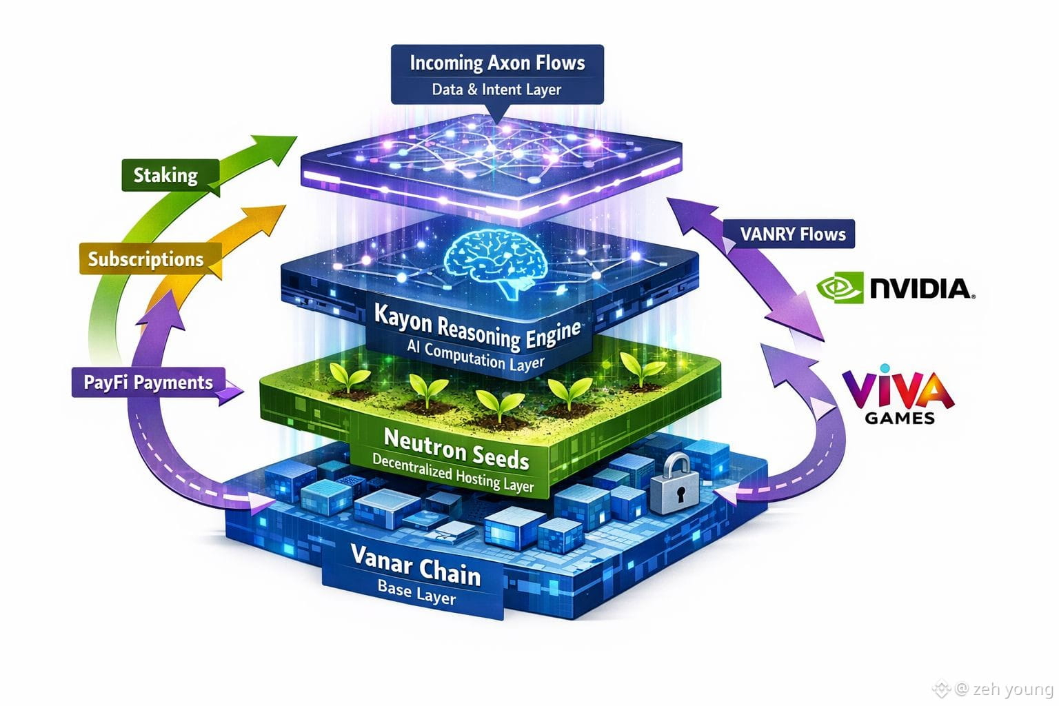 Imagine Vanar Chain as a living, breathing system—AI isn’t just an afterthought, it’s in the DNA. Start with their EVM-compatible base layer: smooth, fast, and developer-friendly, so no one’s reinventing the wheel. Then there’s Neutron, which squeezes huge files into tiny, searchable Seeds stored right on-chain forever. AI agents can pull up insights on the fly, without blowing up the network or your wallet. Next up is Kayon, the decentralized brain making real-time decisions. Axon and Flows are coming soon, and with those, dApps will start learning, self-tweaking, and optimizing—almost like they’re alive. It gives me chills, honestly, because this is the answer to every brand trying to break into crypto without getting wrecked by fees or lag. Vanar’s got predictable speed, which is already pulling in big Web2 names—think Viva Games with 700 million downloads, or powerhouses like NVIDIA and Google Cloud. VANRY is the glue: it’s required for every gas payment, staking in their Proof of Reputation model to earn rewards, and it’s how holders get a say in upgrades. Subscriptions are coming in Q1 2026, locking in demand and fueling buy-backs that’ll squeeze supply even tighter.