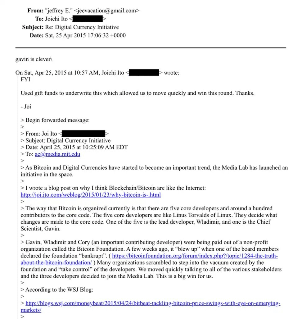Im Jahr 2015 schrieb Joi Ito, der damalige Direktor des MIT Media Lab, in einer E-Mail an Epstein: „Dank dieser großzügigen Mittel können wir schnell handeln und diese Runde gewinnen.“ Er fügte hinzu, dass „viele Organisationen versuchen, sich einzuschleichen und die Bitcoin-Entwickler zu kontrollieren“.