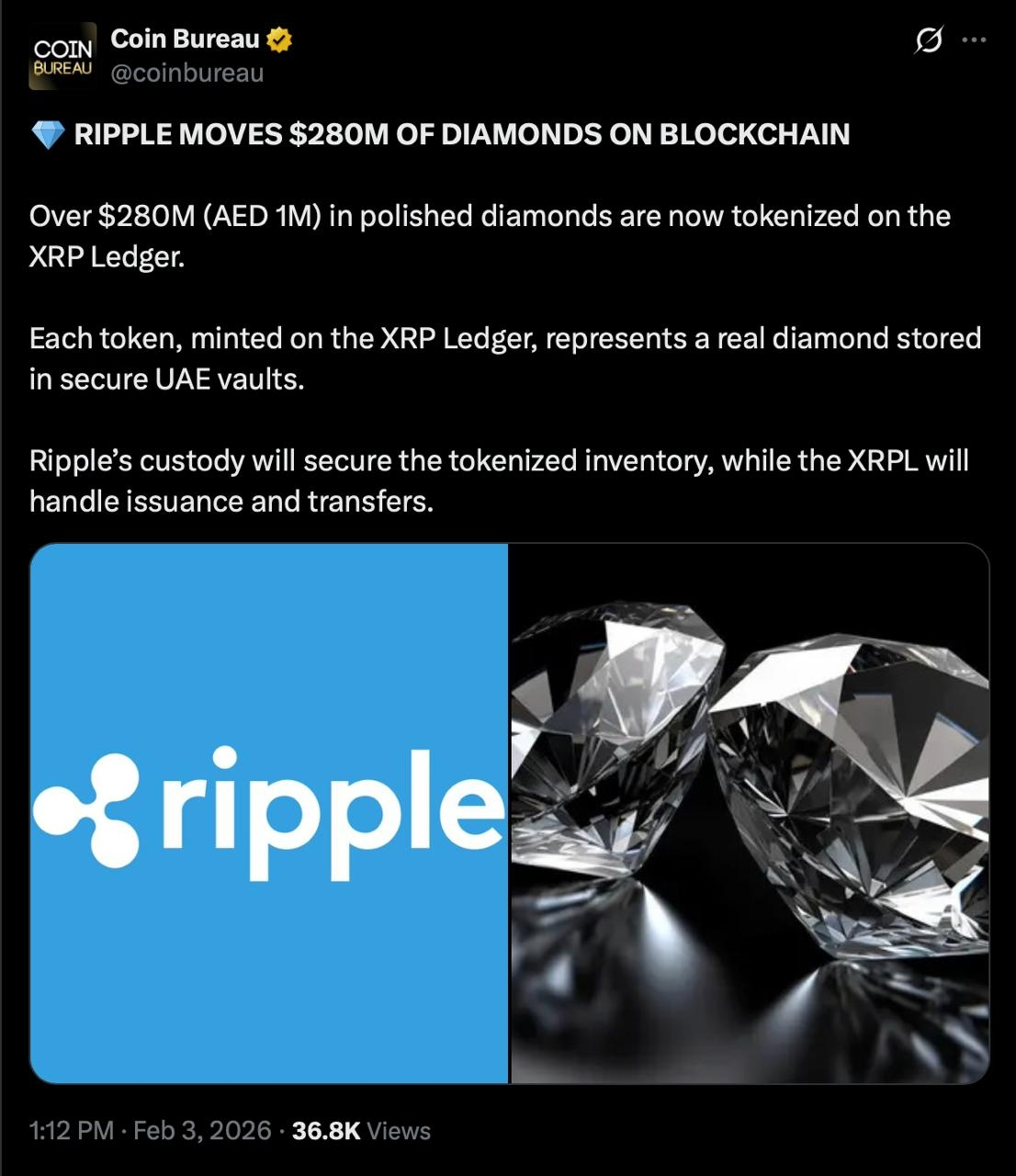 Unter der im Announcement skizzierten Struktur schützt Ripples Verwahrungslösung den zugrunde liegenden Diamantenbestand, während das XRP-Ledger die On-Chain-Schienen für die Prägung, Übertragung und Abwicklung von Eigentumstoken bereitstellt. Dieses Setup ermöglicht es, traditionell illiquide Vermögenswerte wie Diamanten programmierbar, übertragbar und potenziell zugänglicher innerhalb digitaler Finanzmärkte zu machen.
