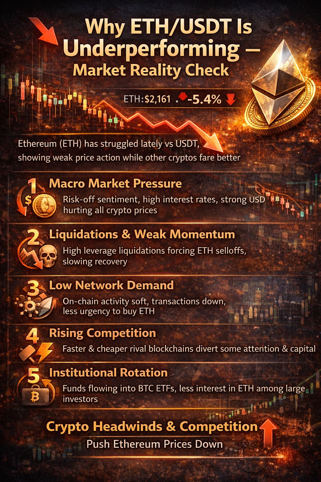 Ethereum (ETH), die zweitgrößte Kryptowährung der Welt, hat in letzter Zeit Schwierigkeiten, eine starke Preisperformance zu liefern, insbesondere im Vergleich zu Bitcoin und einigen Altcoins. Zum heutigen Stand wird ETH bei etwa 2.100–2.300 USDT gehandelt, was eine gedämpfte Bewegung und Druck auf den Preis zeigt.