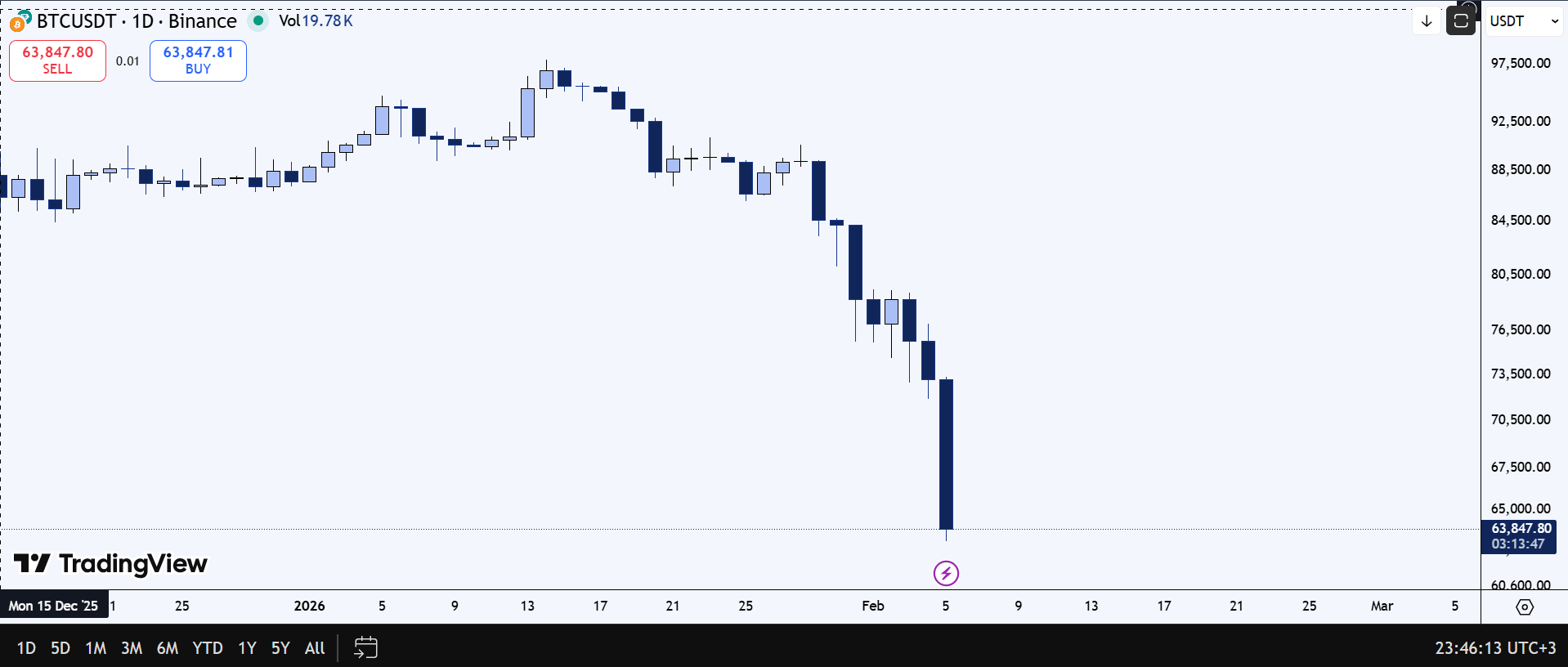 Dann eine große Abwärtskerze direkt auf $63K