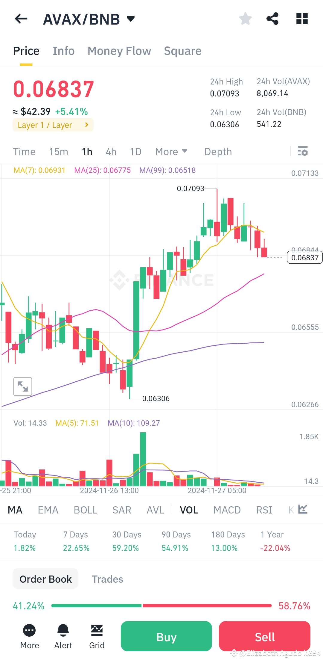 The $AVAX / $BNB chart shows a bullish trend with a current price of $0.06837, representing a 5.41% increase in the past 24 hours. The 24-hour high was $0.07093 and the low was $0.06306.