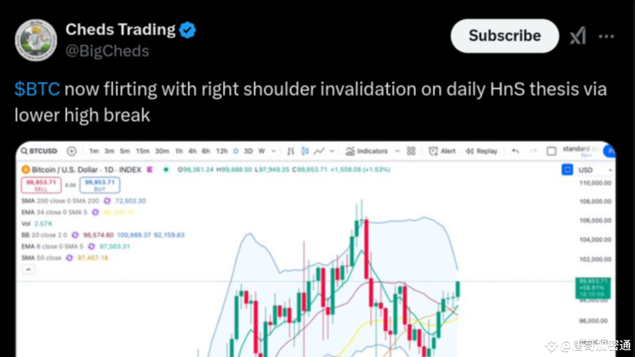 著名交易员 Aksel Kibar 在 X 上表示,BTC 长期图表的目标价为 137,000 美元,看起来未来有进一步上涨的空间。而 Cheds Trading 则提到,日线图上的头肩顶形态可能面临失效的风险,暗示短期内可能不会出现显著的下跌。