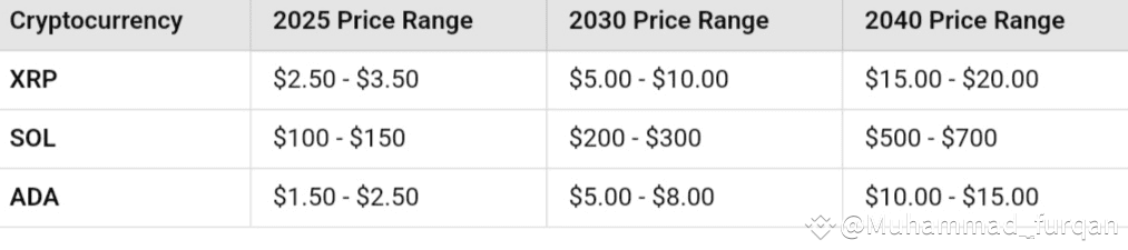 | Cryptocurrency | 2025 Price Range | 2030 Price Range | 2040 Price Range |