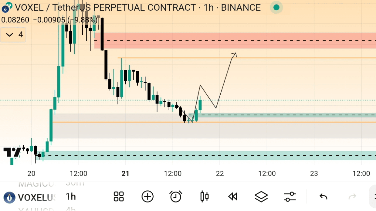 $VOXEL pumped continuously from $0.022 to $0.15 level. Which has 500% gain 🎉that's very insane for spot traders. Now the price of Voxel at $0.08 and at this price have 1H FVG but there are no strong level to Get Risk.