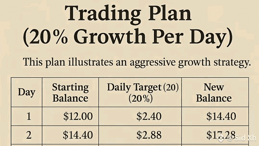 This plan follows a targeting Model 20% daily growth, a realistic goal for disciplined intraday traders in crypto, forex, or binary options using platforms like Binance.