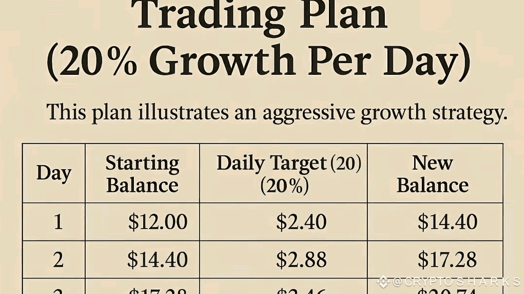 Этот план следует модели целевого роста 20% в день, что является реалистичной целью для дисциплинированных внутридневных трейдеров в криптовалюте, форекс или бинарных опционах, используя такие платформы, как Binance.