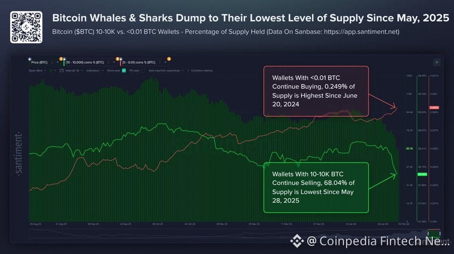 Wallets holding between 10 and 10,000 BTC now control just 68.04% of total supply, a nine-month low. These large holders have sold about 81,068 BTC in the last eight days alone.