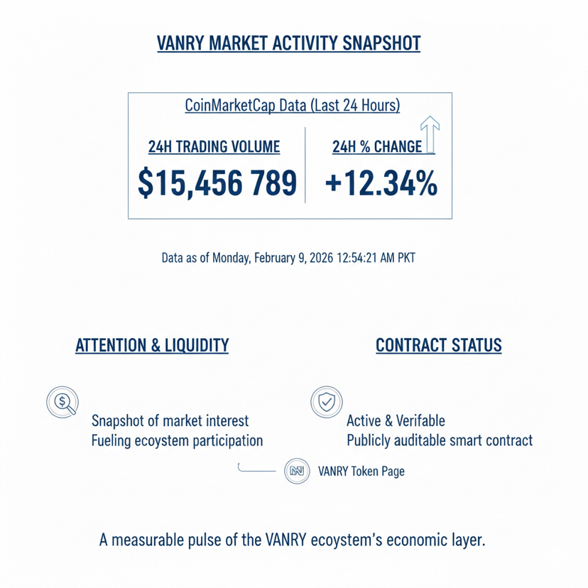 For the last 24 hours, the cleanest public signal you can point to without guessing is the measurable activity around the VANRY market footprint on major trackers, because CoinMarketCap shows a live 24 hour trading volume and a 24 hour percentage change for VANRY, and while this is not a substitute for product progress it is still a useful snapshot of attention and liquidity conditions around the token that powers the ecosystem, especially when combined with the fact that the contract itself remains active and publicly verifiable through its token page.